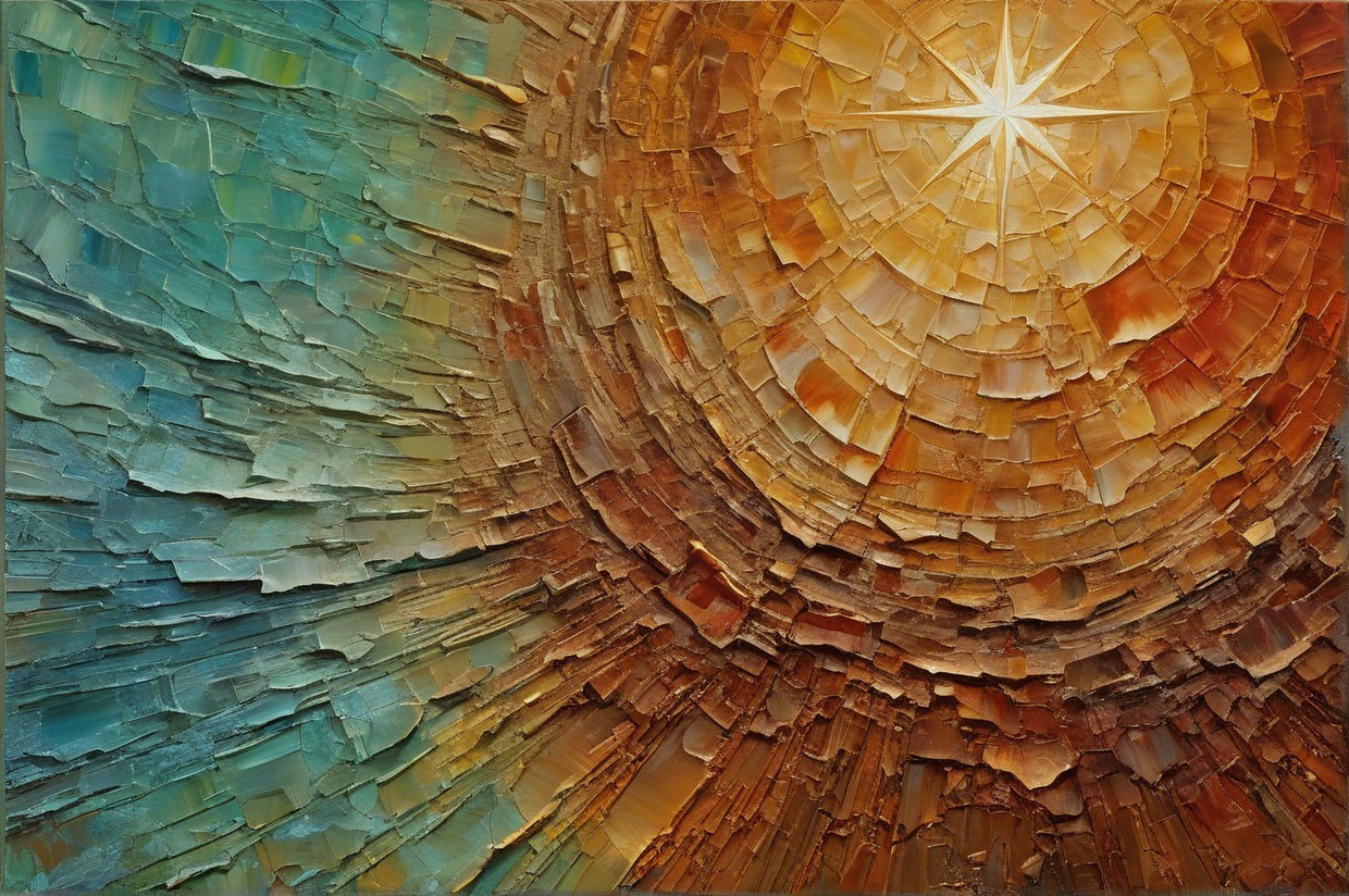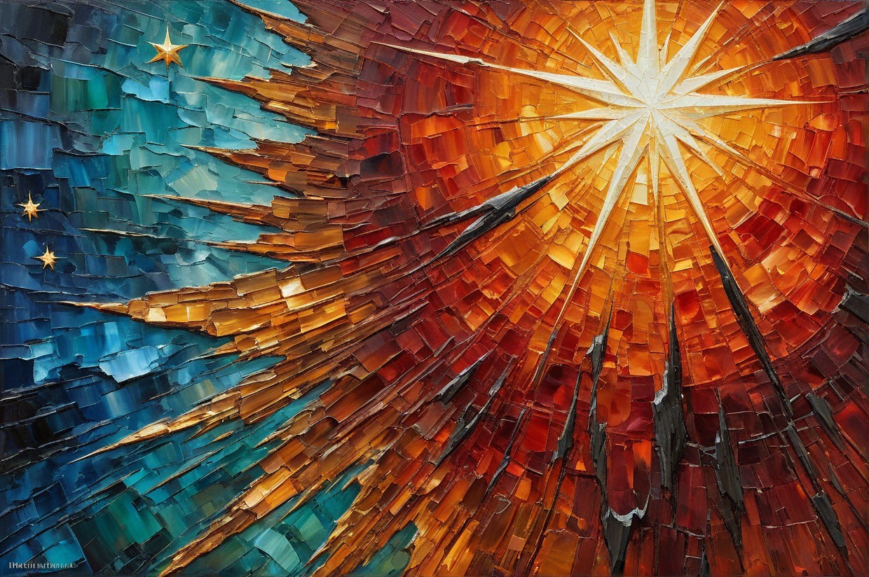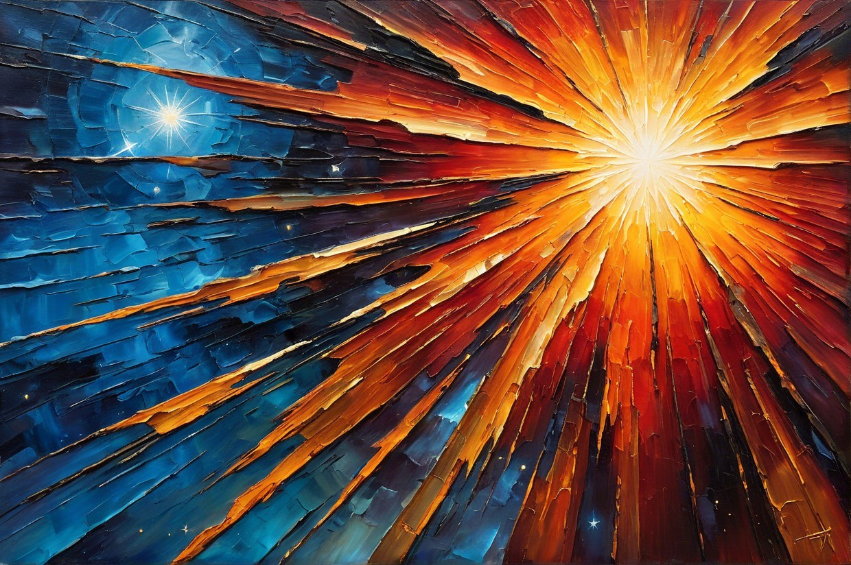 A vibrant cosmic scene features a radiant sun bursting with orange and yellow hues, surrounded by jagged rays. To the left, a deep blue planet contrasts against a starry background.