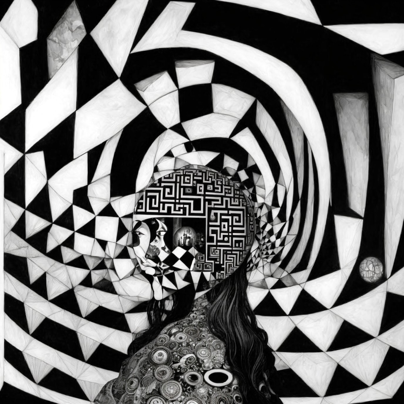 A monochrome surrealist artwork depicting two stylized faces with intricate patterns, set against a backdrop of swirling geometric shapes.