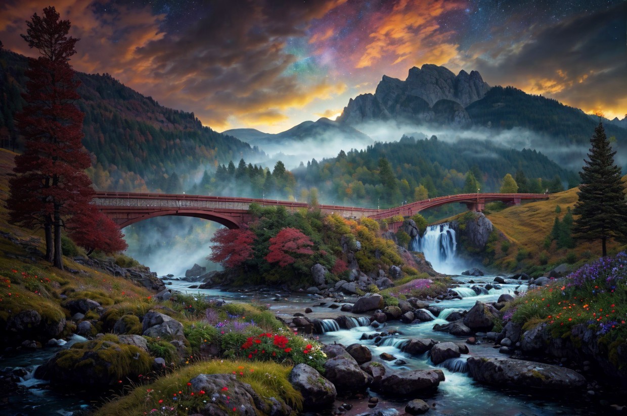 + Prompt:highland landscape in mountains, rocky road and stream, red and purple glorious sunset, burning fire and red sun, Conquest of Paradise, cosmic sky, nice waterfalls and a beautiful tree and path, bridge over river, some flower details by Gustav Klimt , elegant fantasy, intricate beautiful wallpaper colourful, Van Gogh