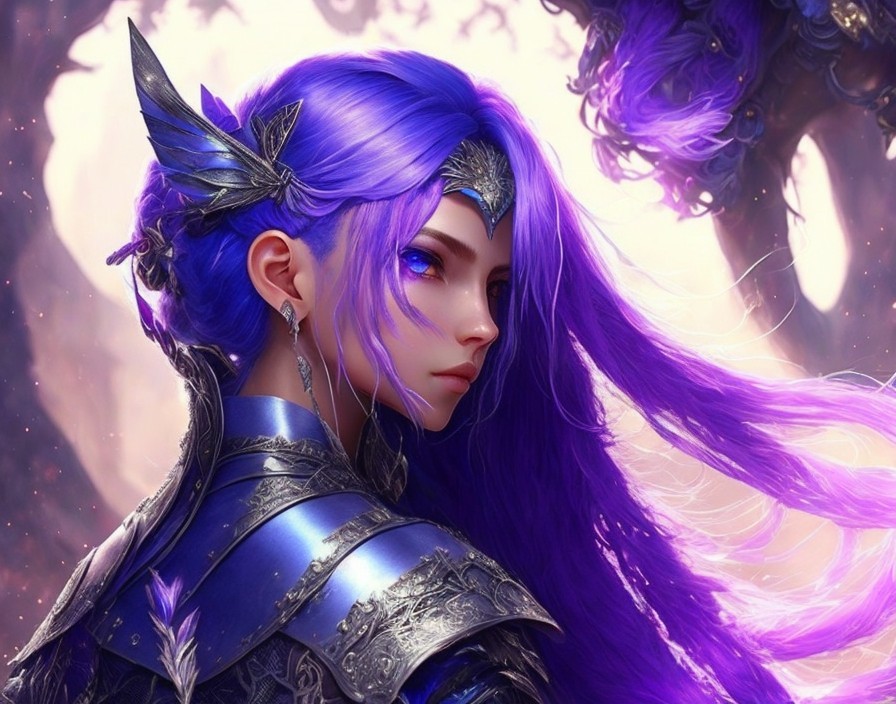 elf ,silver and blue and purple hair,good with all kinds of wepens ,strong,intelegent,good with animals and nacher, magicel,colerful but not,powerful magicle purple wissped of magical stuff and a sworded on her side and a bow an arows on her back, cute and pritty