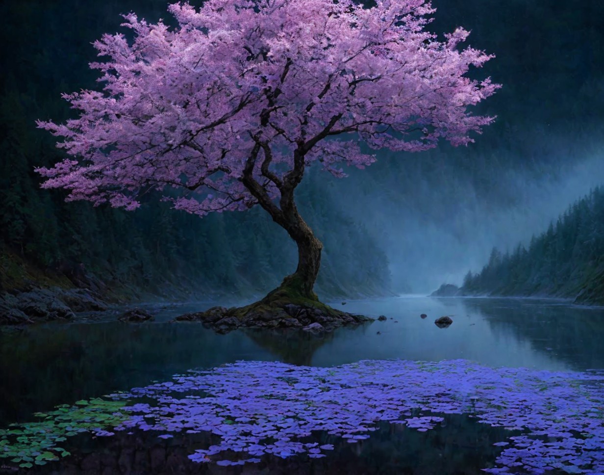 A serene landscape features a blooming pink tree beside a calm lake, with purple water lilies floating on the surface. Misty mountains and a starry sky create a tranquil atmosphere.
