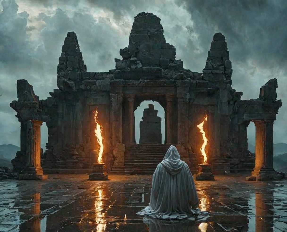A cloaked figure kneels before ancient, flame-lit ruins under a stormy sky.