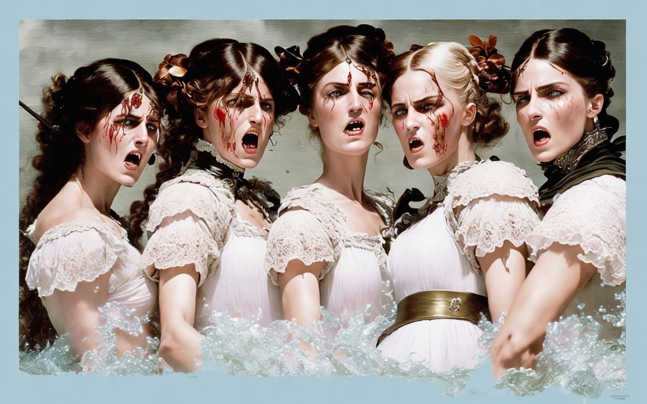 A dramatic portrayal of five muscular warriors, each showcasing intense expressions. They wear ornate costumes with bold patterns, emphasizing their fierce demeanor and dynamic poses.