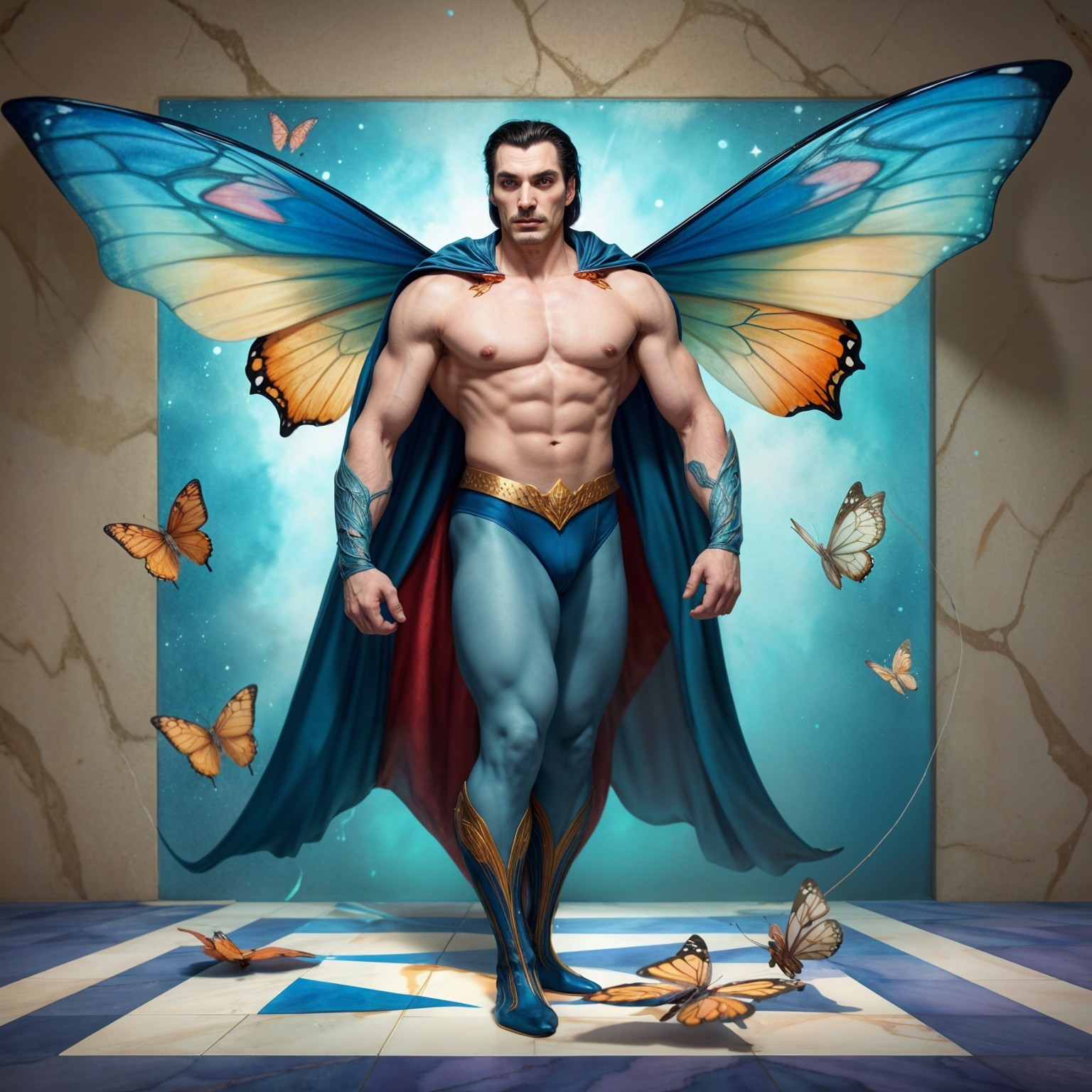 A muscular figure with vibrant blue butterfly wings hovers gracefully, surrounded by colorful butterflies. He wears a cape and has a confident expression, set against a whimsical, decorative background.