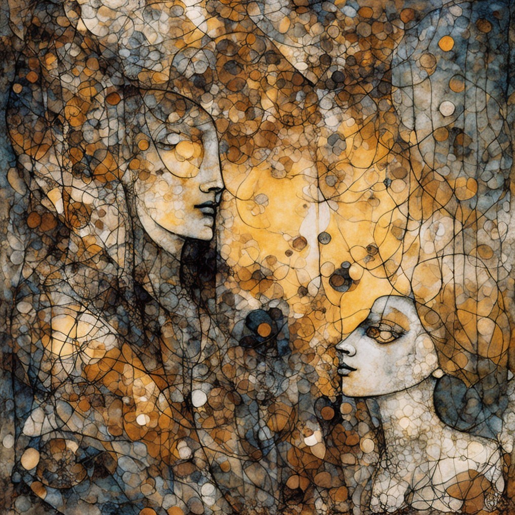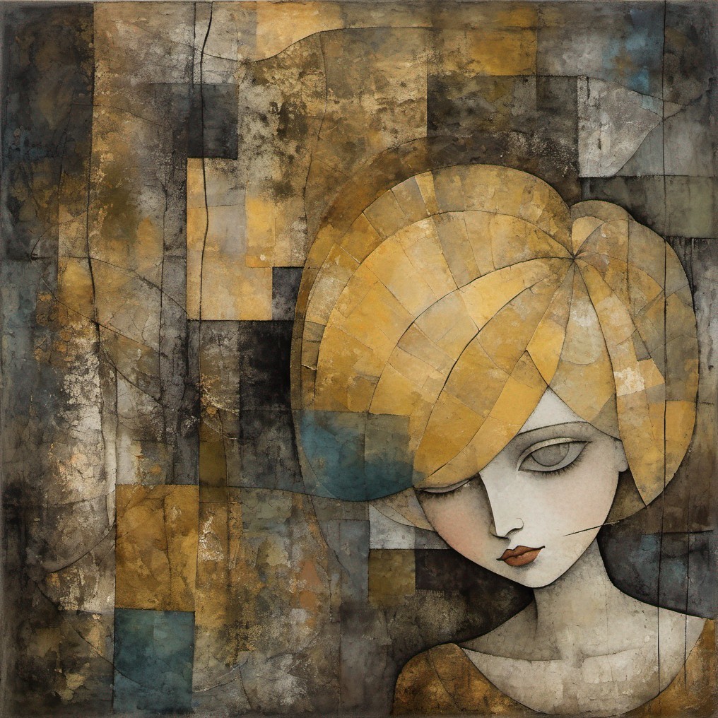 An abstract painting featuring a stylized female face with a neutral expression, set against a textured golden background with circular motifs.