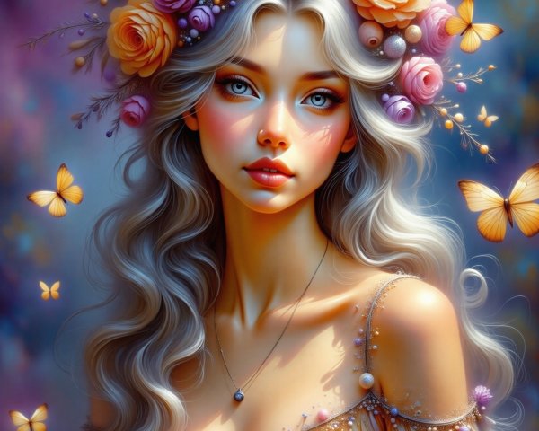 In a magical mountain forest, vibrant flowers bloom beneath towering trees. Sunlight filters through the canopy, illuminating a charming princess and her forest king, surrounded by colorful butterflies and playful wildlife.
