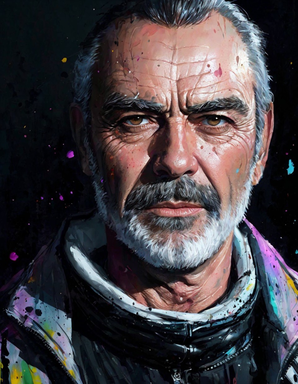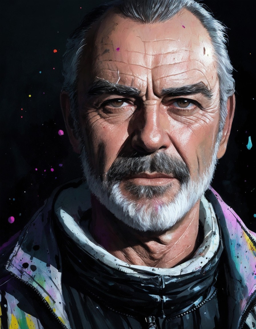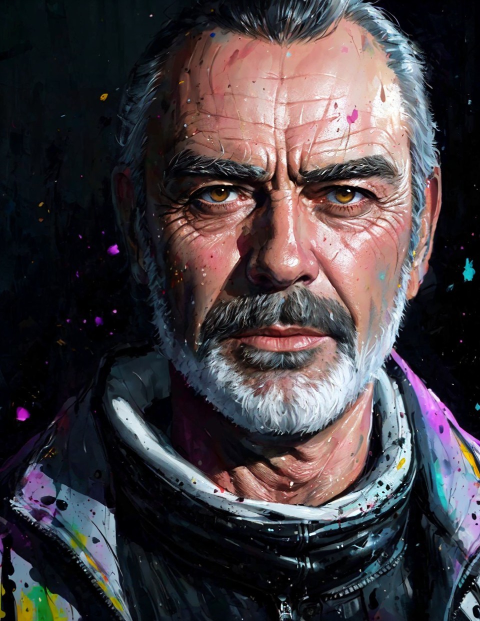 Prompt: "high deailed portrait of Sean Connery! Speedpaint with mixed brush strokes size by Junji Ito; robert oxley! Ismail Inceoglu; Gazelli; M.W. Kaluta; richard anderson; Bump paint splatter and drips; drip painting; Holi Color Rush; fancy 3D Liquid Glossy Color;"