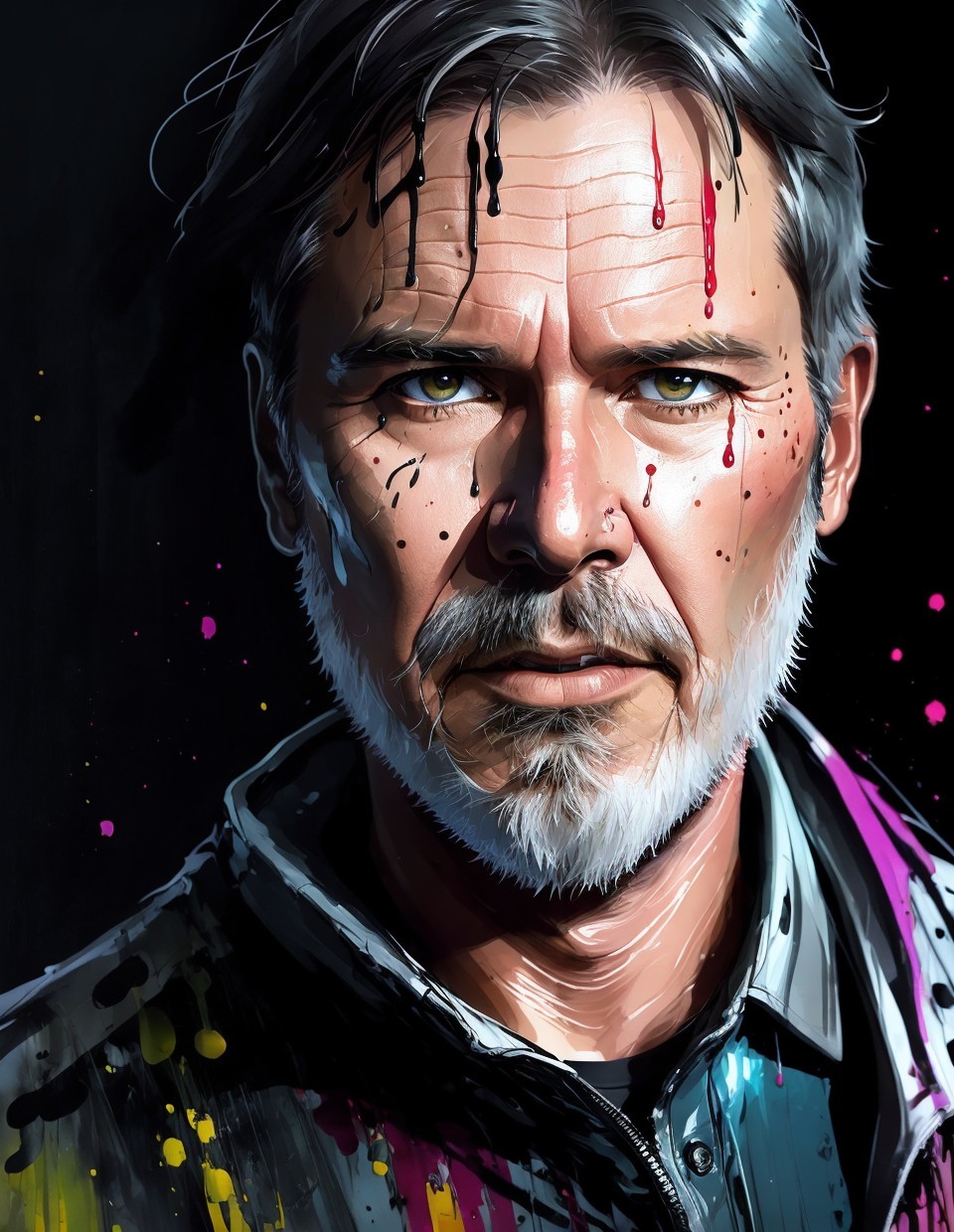 Prompt: high deailed portrait of Harrison Ford! Speedpaint with mixed brush strokes size by Junji Ito; robert oxley! Ismail Inceoglu; Gazelli; M.W. Kaluta; richard anderson; Bump paint splatter and drips; drip painting; Holi Color Rush; fancy 3D Liquid Glossy Color;