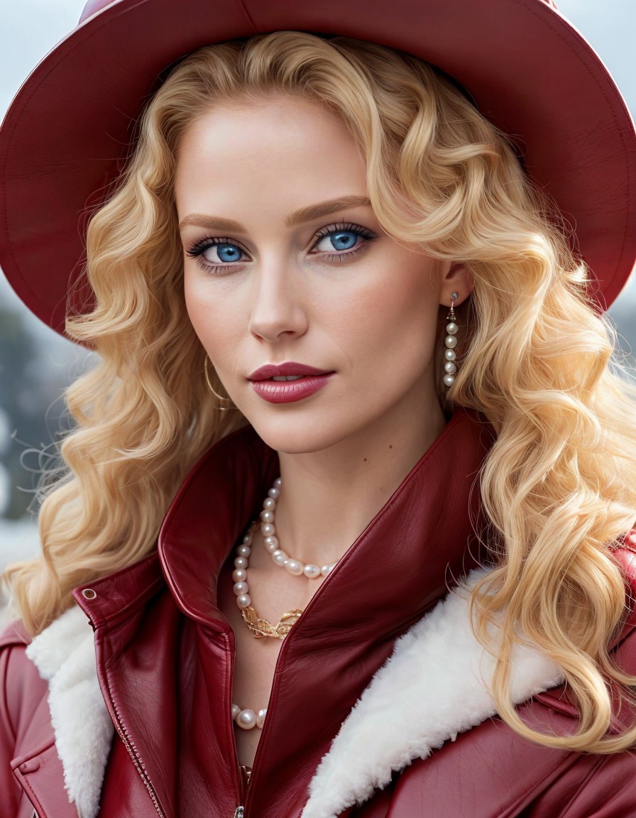 A woman with blonde curls, wearing a red hat, pearl earrings, and a leather jacket, gazes intently at the camera.