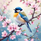 A vibrant blue and orange bird perches gracefully on a branch adorned with soft pink cherry blossoms, set against a gentle, pastel background, evoking a serene spring ambiance.