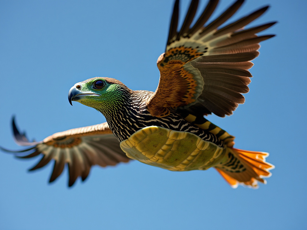A fantastical creature with the body of a turtle and bird-like wings soaring against a clear blue sky.
