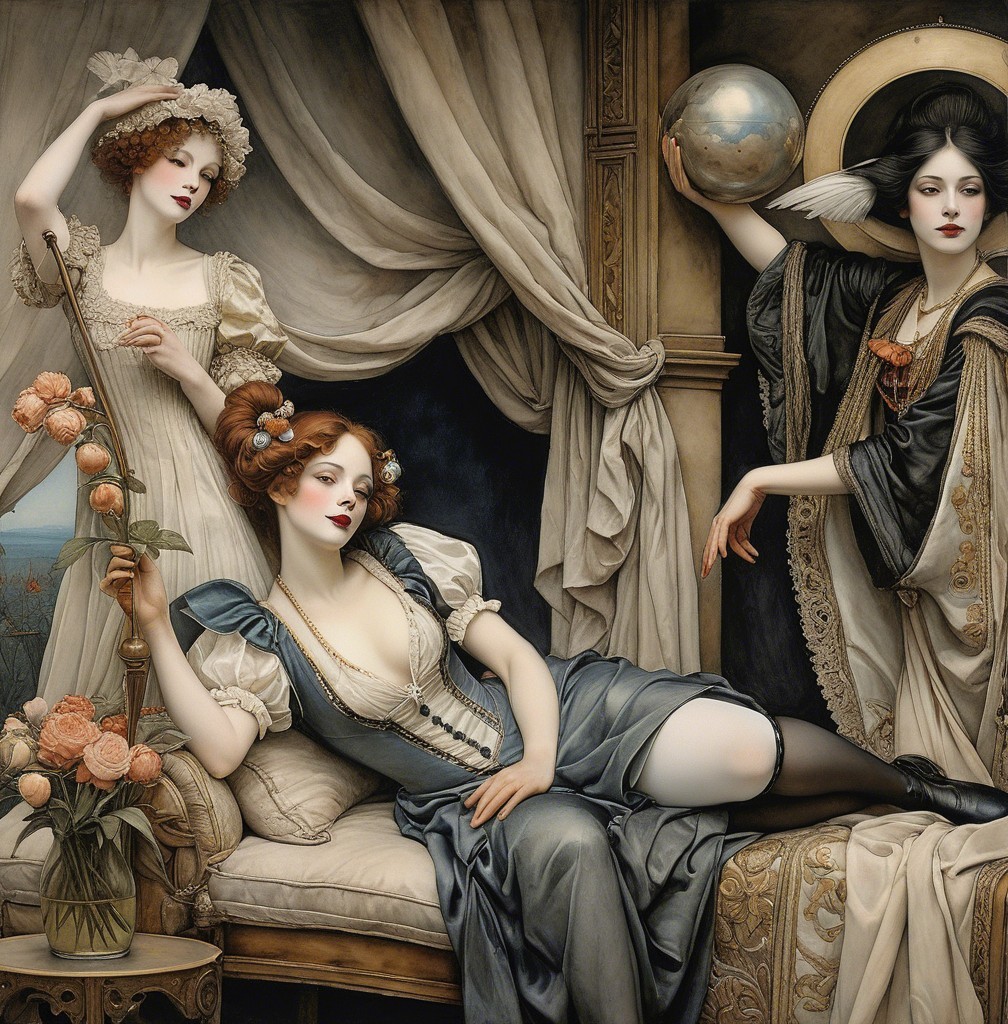 A vintage-inspired scene features a elegantly dressed woman in a historical gown, seated beside a whimsical porcelain doll. They share a playful connection, adorned with vibrant colors and intricate details.