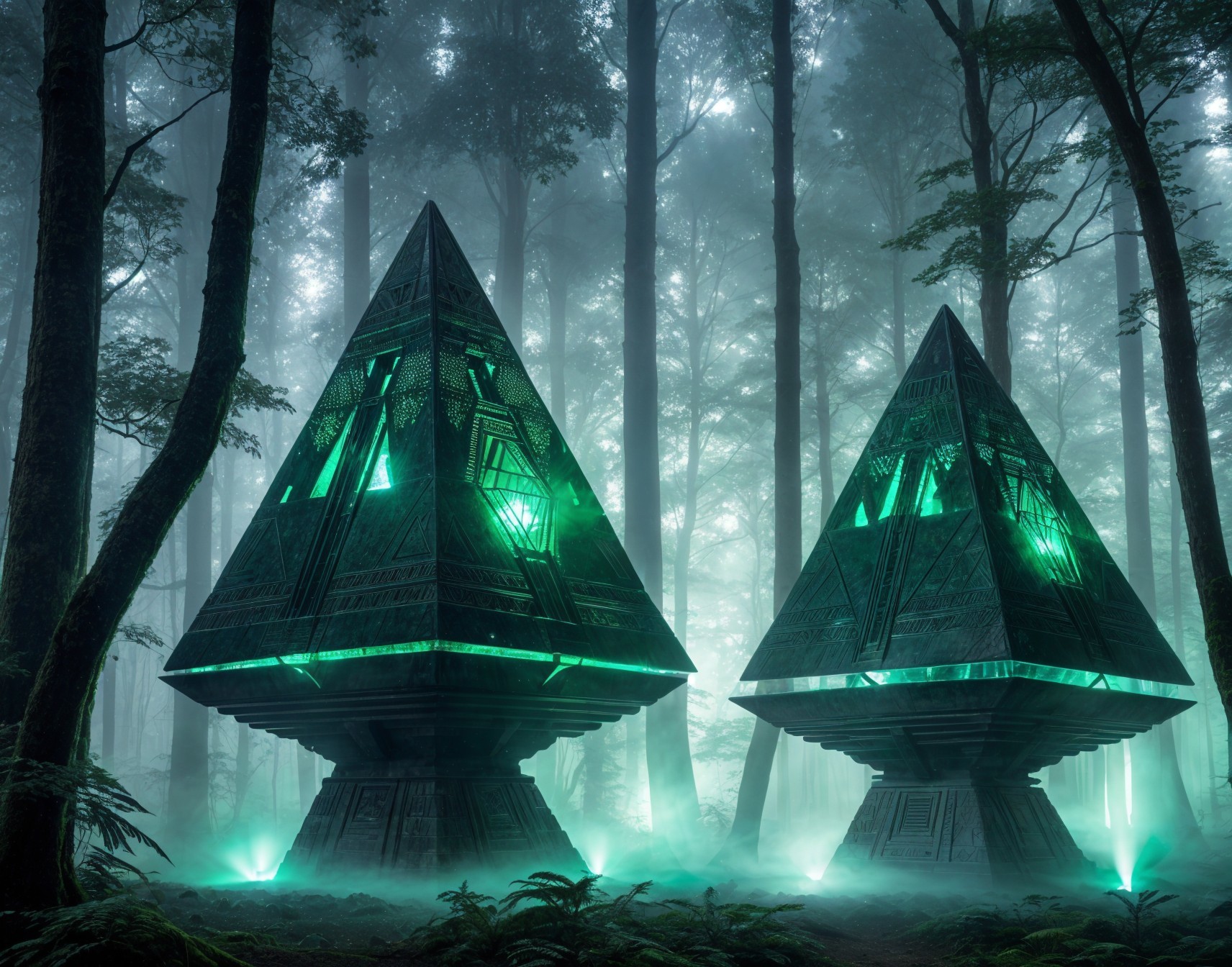 In a misty forest, two large, intricately designed pyramids emit a soft green glow, surrounded by towering trees and ethereal light, creating a mystical and otherworldly atmosphere.