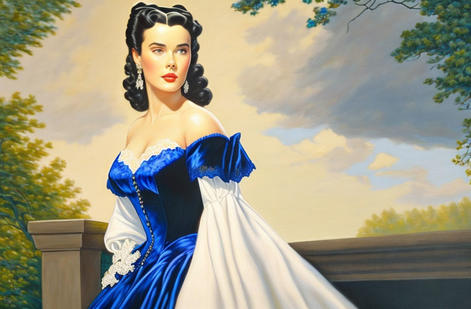 Woman in Elegant Blue Dress with Puffed Sleeves on Cloudy Sky Background