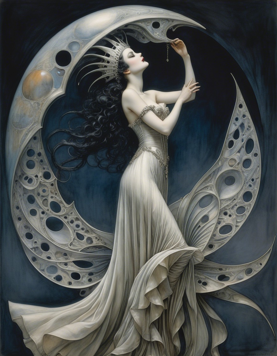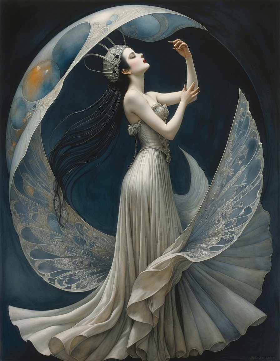 The image features a mystical figure draped in a flowing, ethereal gown, adorned with intricate patterns and a celestial backdrop. She poses elegantly, embodying elegance and otherworldly beauty.