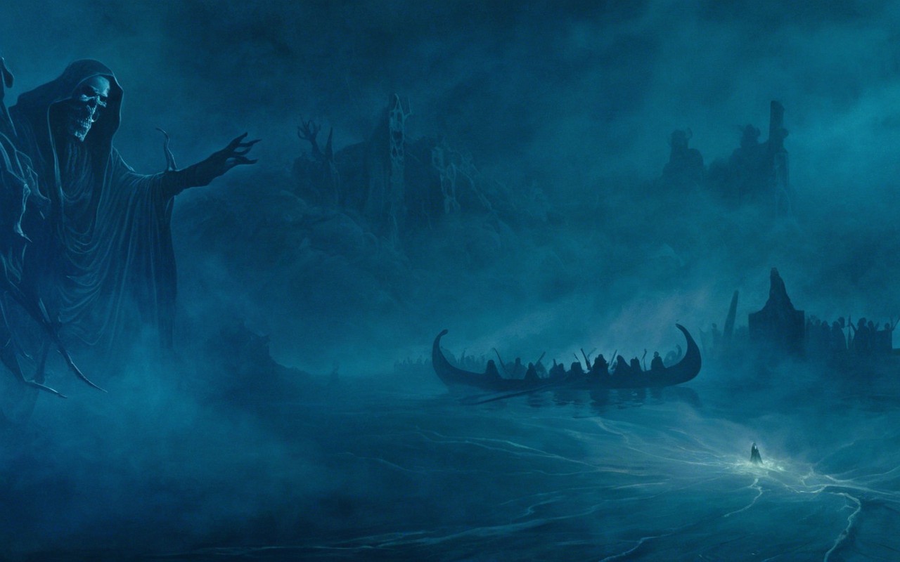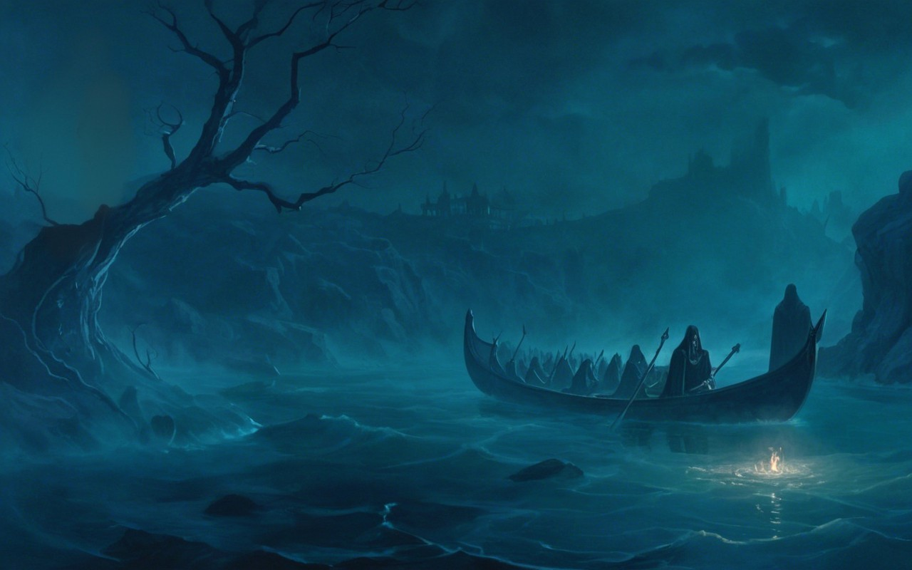 In a haunting, misty landscape, dark figures in hoods are rowed across the River Styx by Charon.