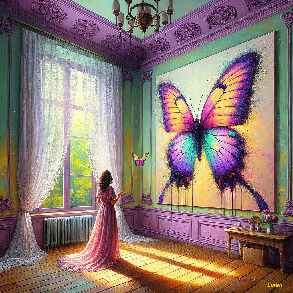 A woman in a purple dress gazes at a large, colorful butterfly painting in a room with violet walls, a wooden floor, and a sunlit window.