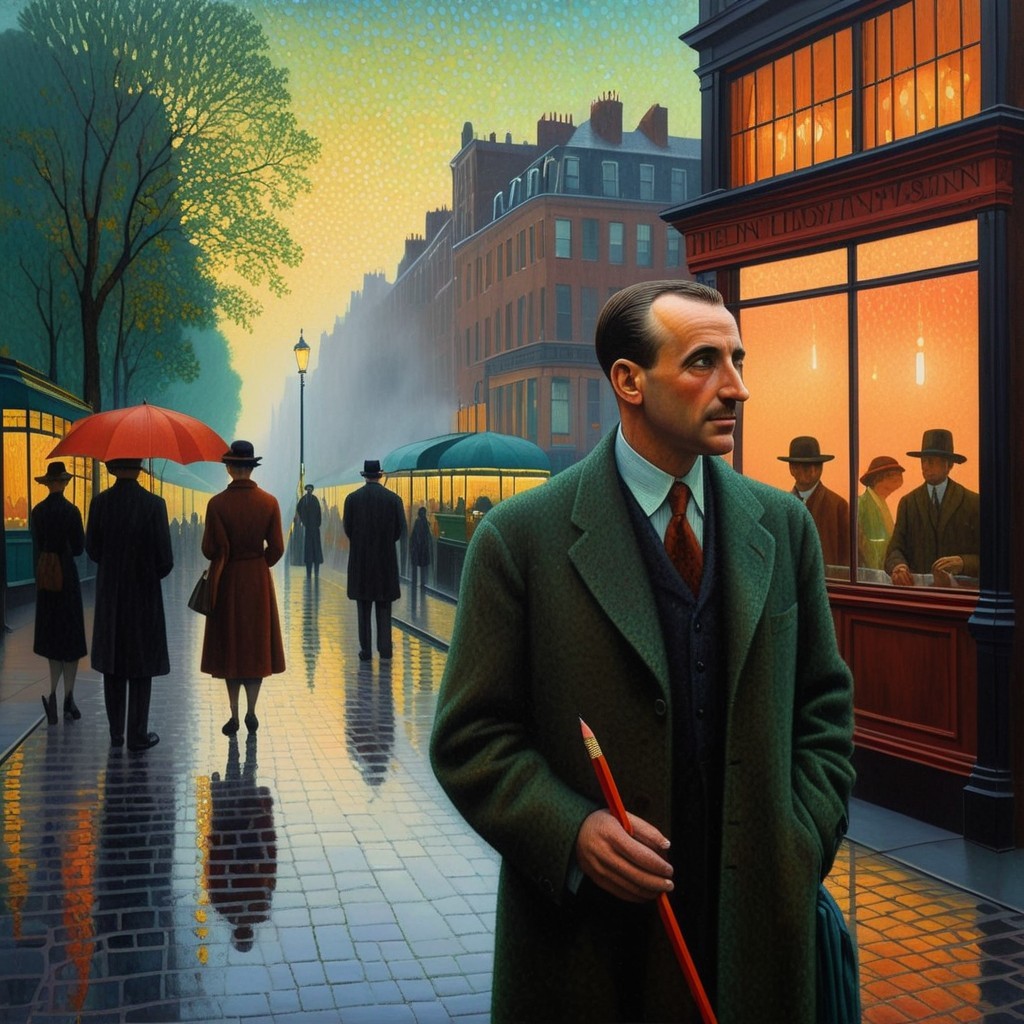 A man in a brown coat stands in a vibrant park with autumn trees, surrounded by people. The background features soft hues and a distant skyline, creating a nostalgic urban atmosphere.