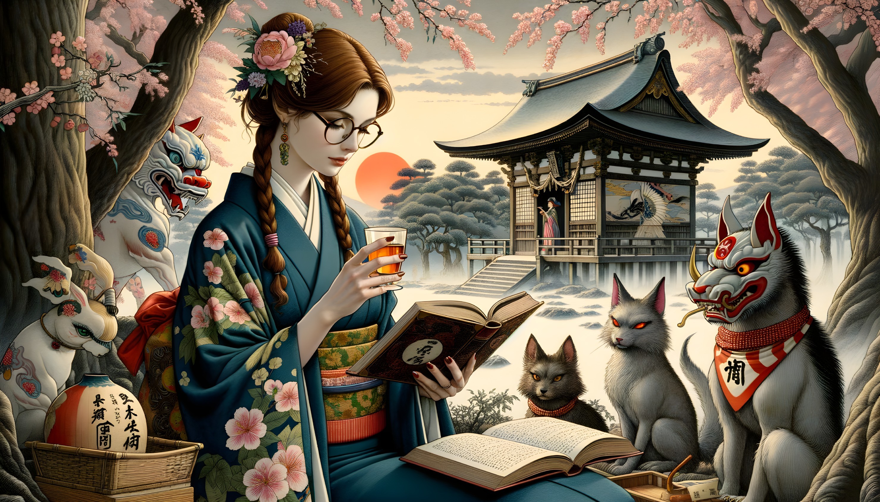 A woman in a kimono reads a book among cherry blossoms, flanked by mythical foxes and a temple backdrop at sunset.