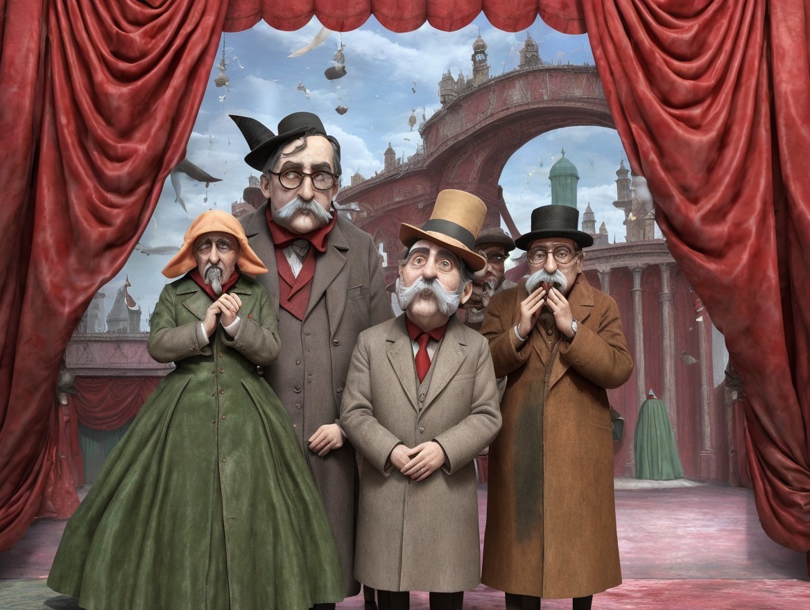 + Prompt:3D, surrealism, torn red curtain, obscure old scientists who look like joke figures, with thick noses, pointed noses and a beggar with thick lips are standing on the stage, they are arguing and cursing, they are wearing colorful long coats with patterns, flat velvet hats, distinctive wrinkled faces, a red torn velvet theater curtain with tears, scraps of fabric and threads hanging down on both sides, in the background a stage set with a falling tree and strange beings under a blue sky, leaves flying around, decaying things, protractors, pipettes, shards, right a piece of collapsed ground, very detailed, complicated, oil on canvas, depth effect, Comedia del Arte, inspired by Egon Schiele and Salvador Dalí