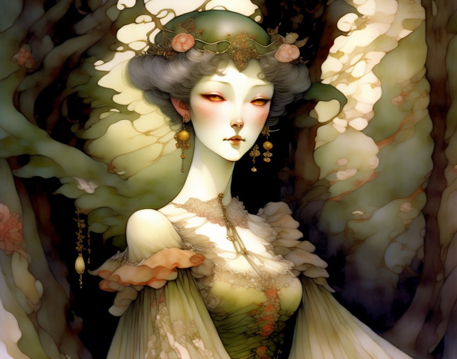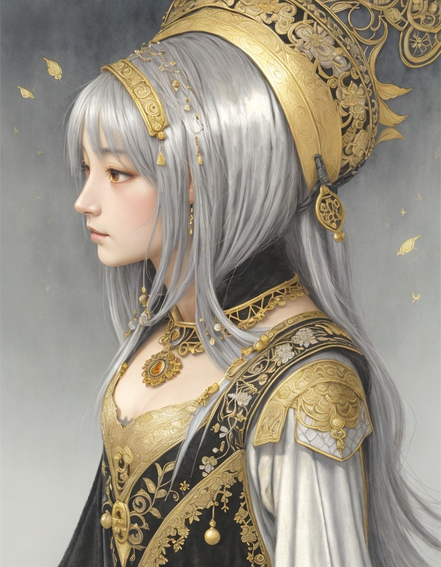 Prompt: Prompt: Legend of the Girl and the Singing Nightingale, Medieval Japanese Artists Sumi-e Style, Velvet Black, Shabby, Dull Gold, Amber Gray, Golden Ratio, Surreal Fantasy, Elegant, High Definition Ultra Fine 3D Line, Zenangle Style, Watercolor Patchwork , Arthur Rackham Style, Paul Kidby, Gediminas Prankevicius, Jacek Jerka, Extremely Detailed, Intricate, Thoughtful, HDR, Fractal, Beautiful, Award Winning, Fantasy Look, Fantasy, Crisp Quality