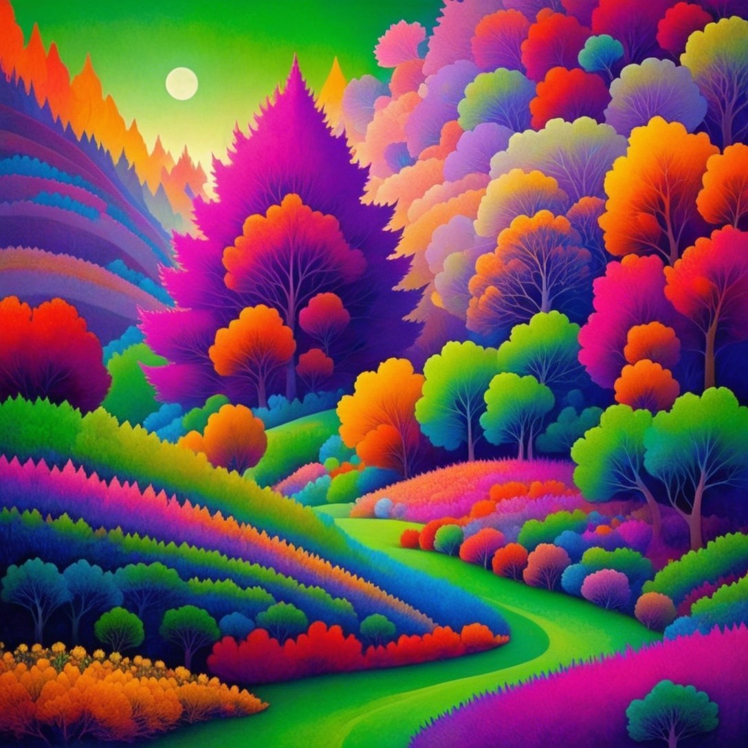 A vibrant landscape filled with colorful trees and hills, showcasing bright hues of purple, pink, and green under a glowing moon. The scene exudes a dreamy, whimsical atmosphere.