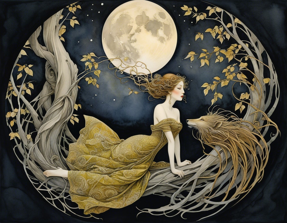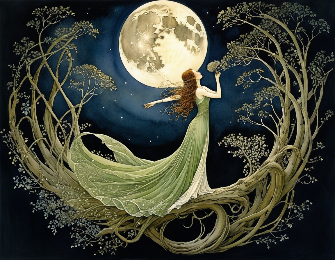 A graceful woman in a flowing white gown dances amidst intricate vines and blossoms, framed by a glowing full moon, embodying a serene, enchanting atmosphere.