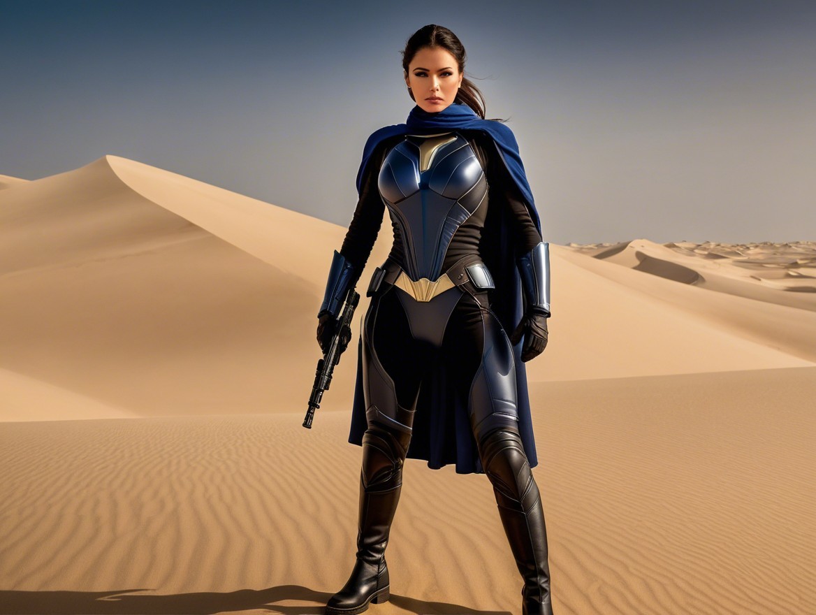 A young woman with striking blue eyes and a serene expression stands in a desert landscape, adorned in a flowing cloak. Behind her, a group of armored figures creates a sense of unity and purpose.