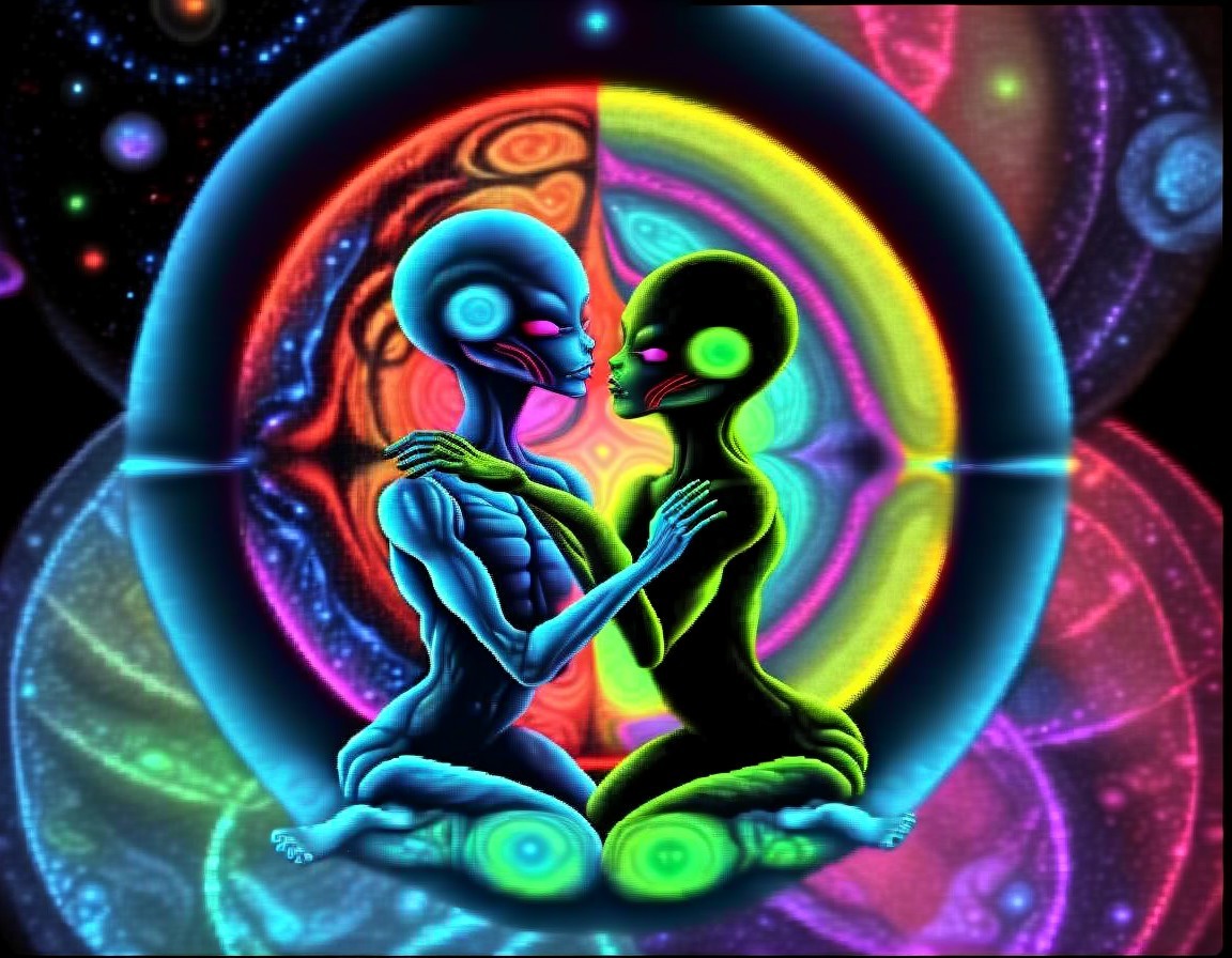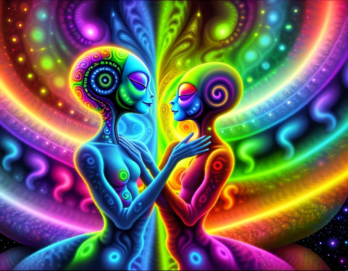 Two ethereal beings with colorful, swirling designs on their bodies are gently touching foreheads, gazing into each other's eyes, surrounded by a vibrant, cosmic background filled with light and patterns.