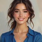 A smiling woman with long, wavy hair, wearing a blue blouse. She accessorizes with elegant silver earrings and a matching necklace, radiating a warm and inviting charm.