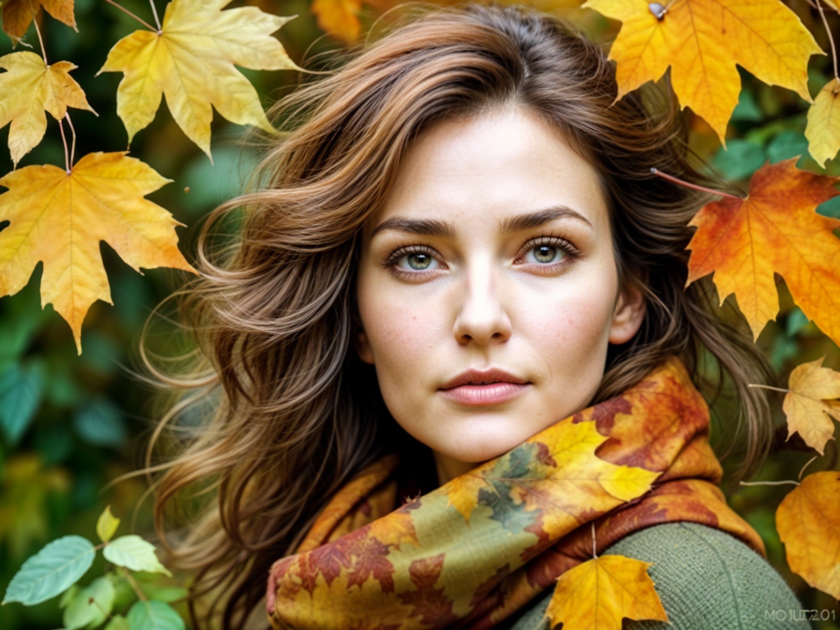 A young woman with wavy brown hair looks softly at the camera, surrounded by vibrant autumn leaves. Dressed warmly, her expression reflects the serene beauty of fall in nature.