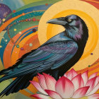 A vibrant, stylized raven stands atop a lotus flower, surrounded by colorful swirling patterns and a radiant sun, blending nature with geometric shapes in a striking visual harmony.