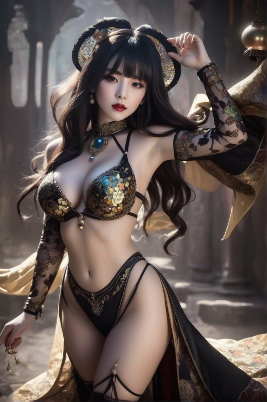 + Prompt:Abstract painting, in the style of gothic illustration, illusory wallpaper portraits, geisha portraiture, dark amber, abstract style of Kandinsky, Burton, Klee. The background is made of multi-coloured lanterns. Intricate, surreal, swirling. Vibrant, festive colours