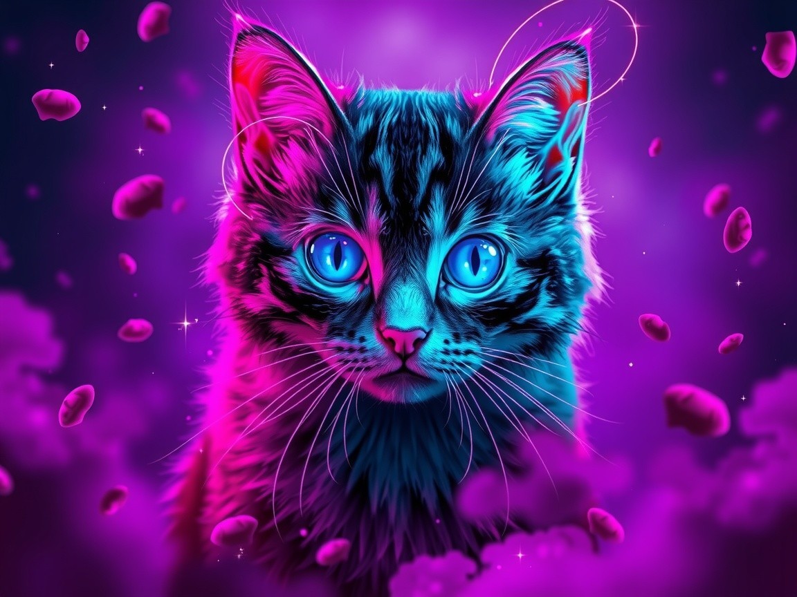 A stunning cat with large, glowing blue eyes is set against a vibrant cosmic background filled with purple and pink hues, stars, and a swirling galaxy, creating a mystical and otherworldly effect.