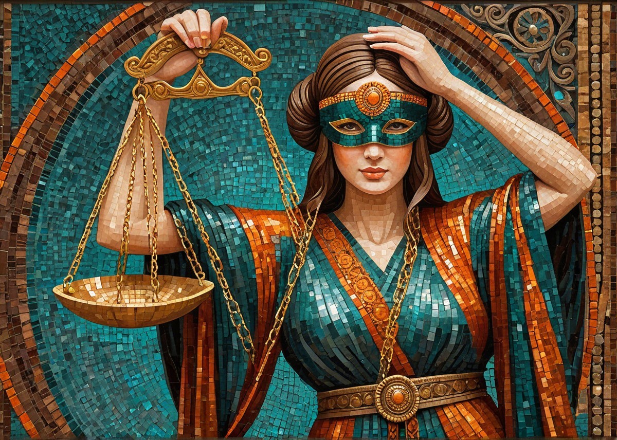 The image showcases a mosaic representation of Justice, featuring a woman wearing a mask and elegant robes, holding scales in one hand and a measuring tool in the other, surrounded by vibrant colors.