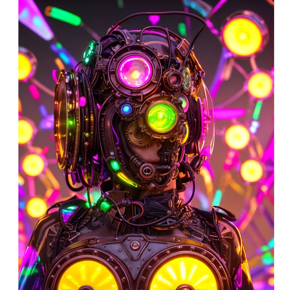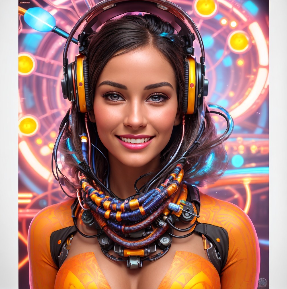 Femme Fatale is tech savvy, sci-fi art, portrait, steampunk, volumetric lighting, intricate patterns in portrait, gilded style, devilish orange eyes, embossed details, vibrant highlighted psychpomp, electrical devices, lightning burst, golden ratio, colourful intricate cyberpunk surrounding, gilded mechanical fittings, luminous dystopian style, blade runner, candyfloss details, science fiction, blueish lighting, intricate plushy highlighted, volumetric lighting, extremely smooth crackles, tints of 1970s advertising art, vector 7:4, blue neon streaks, long perspective, technical essence, triadic color scheme pink orange blue, feathered dreamscape, volumetric lighting, intricate beauty, encaustic plasticity, illustrative maximalism with mechanical fittings, bioluminescent details, gothic tubes, electrical components, technical patchwork, triadic color scheme yellow pink red, trippy extremely plasticity, translucent garments, (transparent:1.5) headset filled with (bioluminescent:2) wires, luminous opalescent , detailed meticulously bioluminescent (glowing:2.1) ornamental : (shimmering:1.3) : (sparkling:1.6) : trippy contrast,highly plasticity, volumetric lighting, intricate brightness