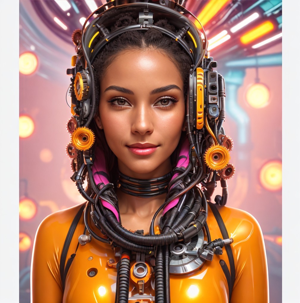 beautiful biomechanic face of a woman, smiling brightly, peaceful and mysterious, covered in tubes, cables, hoses, fittings, tinc, copper, chromium, gears, indicators, screens and electronic components, glossy colors, head and shoulders portrait, detailed painting, vivid colors , acid spill, beautiful iris, sharp focus, in the style of 1970s advertising art, candyfloss flares maximalism, golden ratio, intricate realistic details, triadic color scheme yellow brown red, trippy art, highly detailed strokes, octane render, luminous iridescence, volumetric lighting, extremely plasticity, (transparent:1.5) shell filled with (bioluminescent:2) wires,: luminous opalescent , detailed meticulously bioluminescent (glowing:2.1) ornamental : (shimmering:1.3) : (sparkling:1.6) : extreme contrast and saturation : starry galactic night sky background , fantasy artwork, volumetric lighting :extreme contrast ,:photorealistic fluorescent lighting