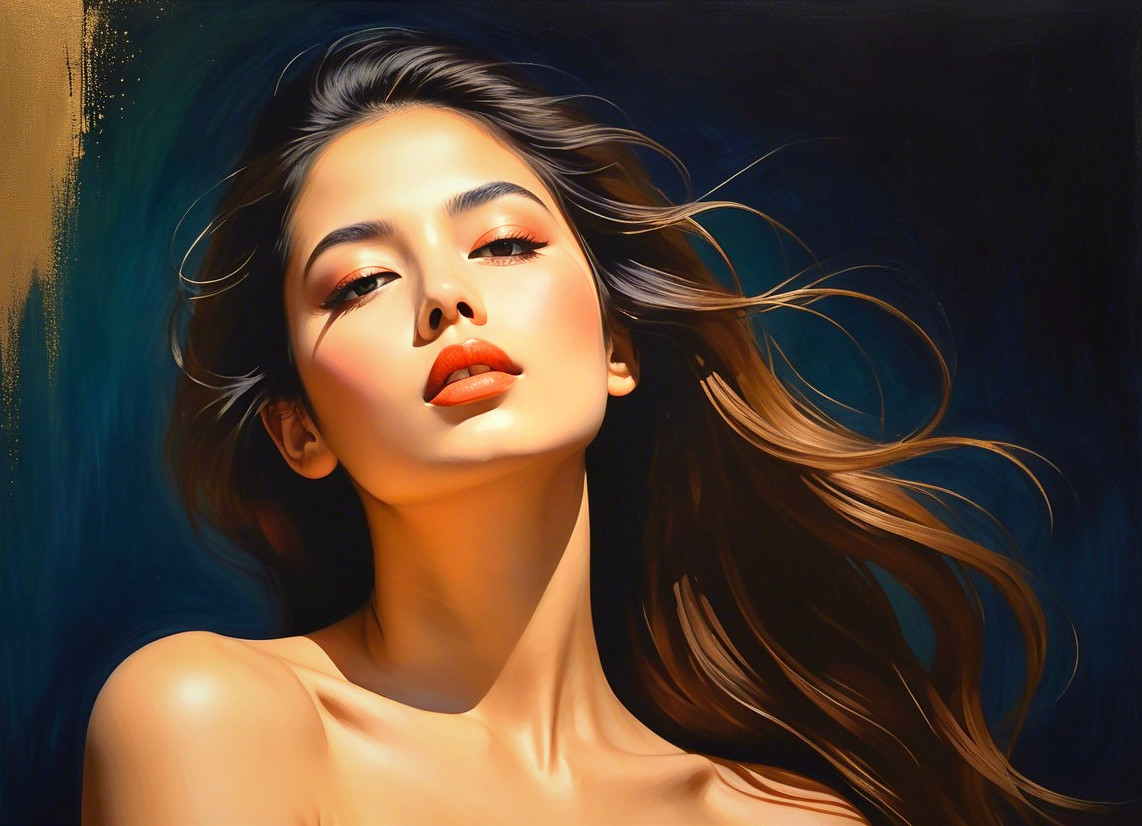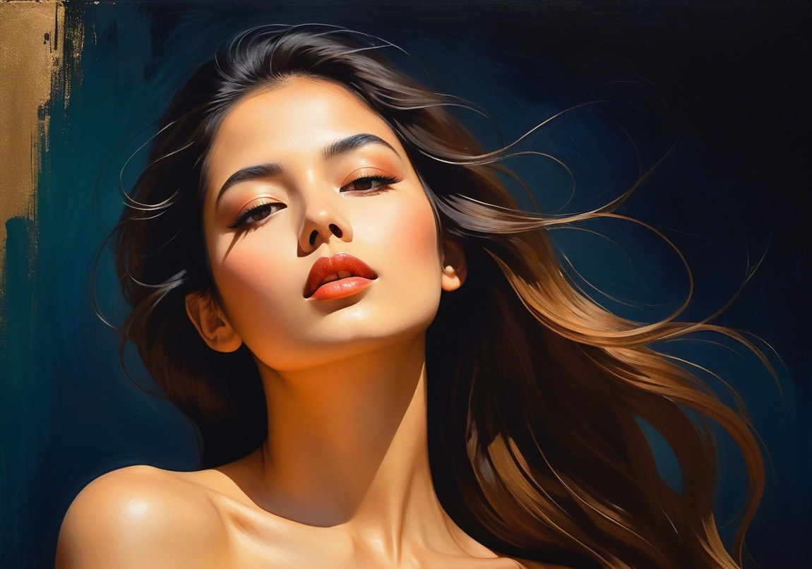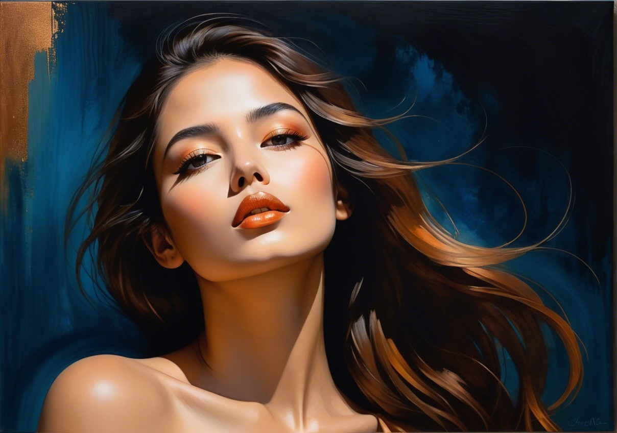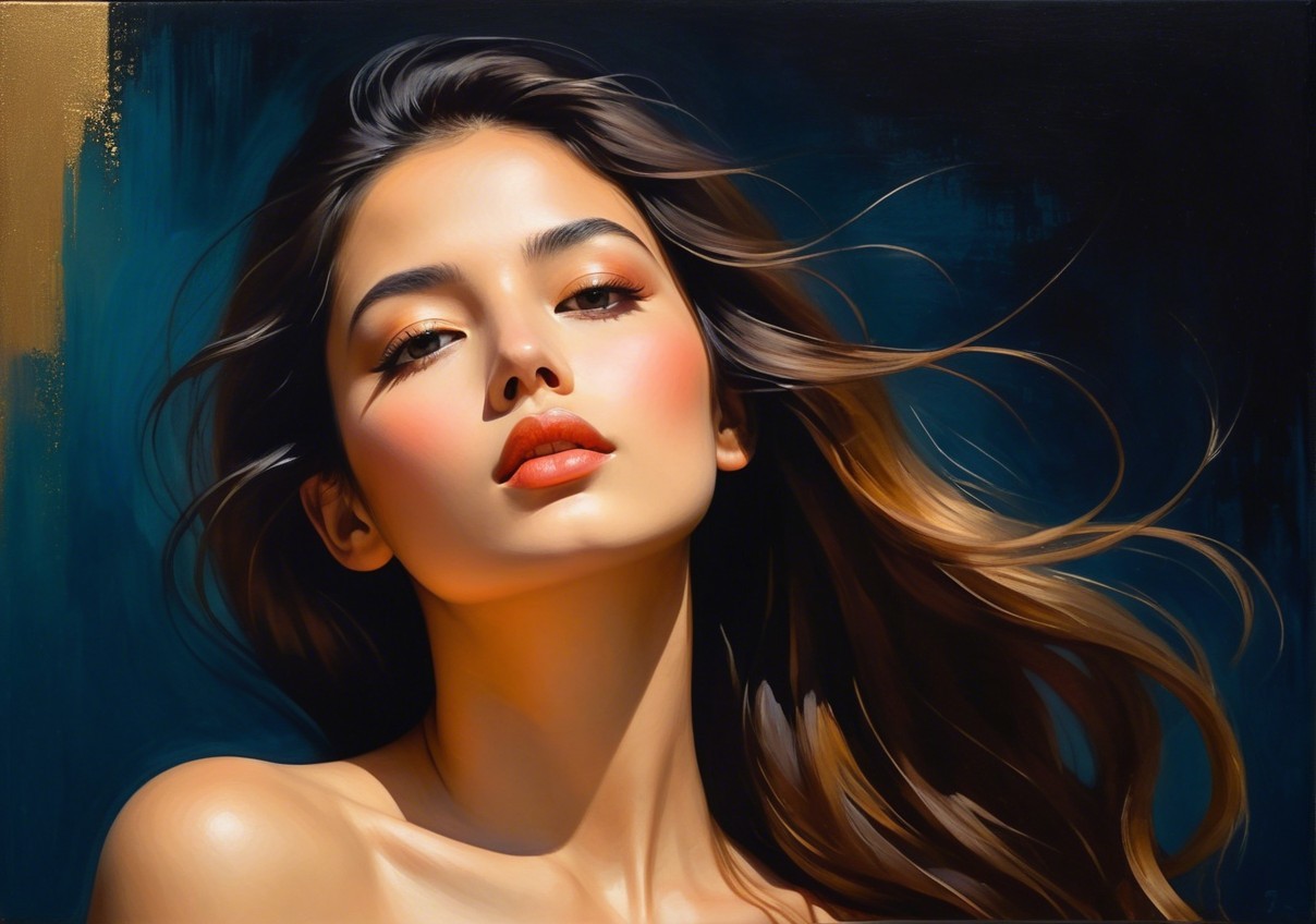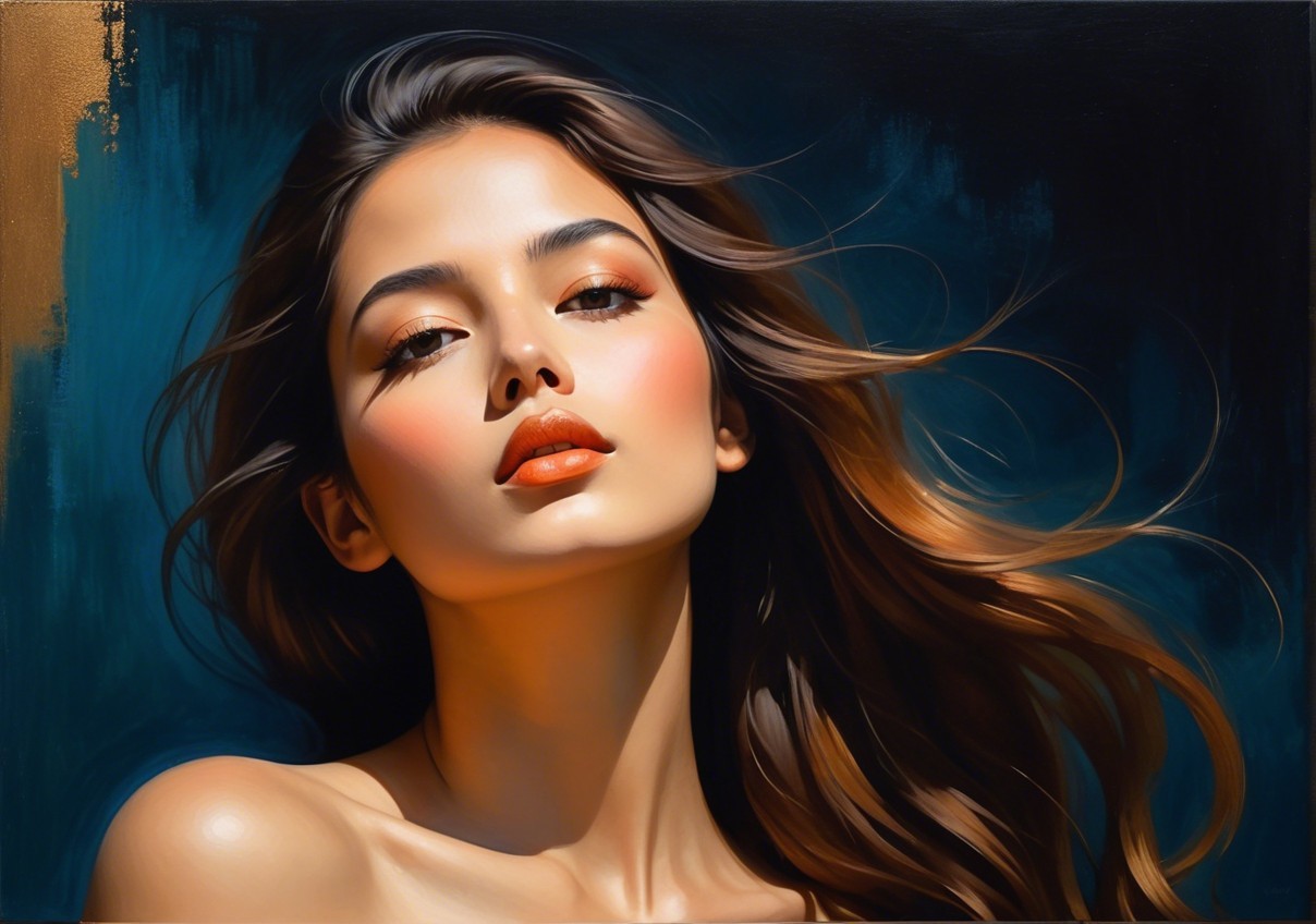 In a serene and modern Zen setting, an abstract yet figurative portraiture unfolds. Old masters's style, tonalism, renaissance style refrerence, multi-layered eyes, slim lips, flowing hair illusion, gradient inking colors, hatching. Shimmering, reflecting, rust-oleum blue, thinned paint #005a8c utilizing alcohol ink to create luminous effects, detailed tinily elements, bathed in golden lighting and soft light, novelty architecture elements, very defined Lissajous lines and beautiful line art. unique touch, warm color palette, sleepy, somnolent, slumberous, languorous but poised, posing, enhancing a simplistic headshot with precise Gelsculpt 64K rendering and a cel-shaded drawing style, stylized portrait, geometrical intricate linework, swirls, cymatics, surrounded by flares, vibrant coloring, fantastical micro-pen lineage, line-art detailing, stippling, push processing technique, post-avantgarde, paint dispersion and muted complimentary natural color gradients. The fluid art technique is evident in the light gold gradient,, shrouded in a pale cinewash. Luminosity 1.3, emulsion shifts, opaque, brightness 1.3, warm tones. Dynamic lighting 1.3, stylized foampunk, airy, joyful, glowing sunlight filtering, shimmering reflections. Enchanting, whimsical, mystical setting, vibrant watercolor and ink, picturesque scenery, colorful palette, high resolution for intricate details, 8k resolution for wallpaper, concept art quality, stunning color oil drawing on textured paper, reminiscent of Jean-Baptiste Monge's style. Capture the essence of William Turner's glowing landscapes, hues by Albert Bierstadt, majestic , warm coloring by Catherine Abel, morning light, fantastical, elegant touch, Amanda Clark's mysterious atmosphere. Infuse the artwork with the beautiful and intricate fantasy elements seen in Mamoru Nagano's style. Merge stunning color oil drawings with gouache details, creating visible textures akin to Ho Baron's work. Utilize a blend of sober oil on canvas