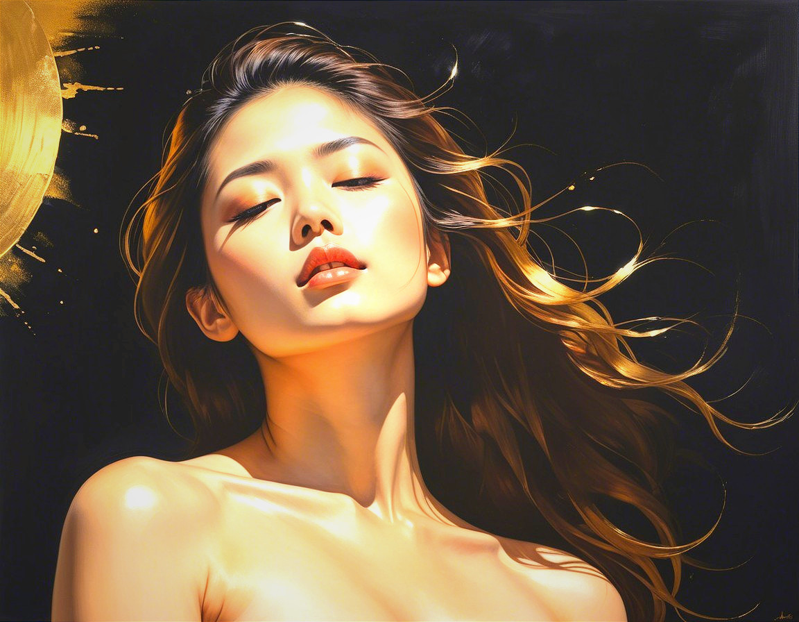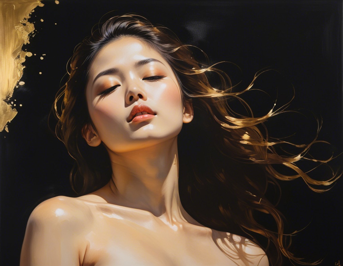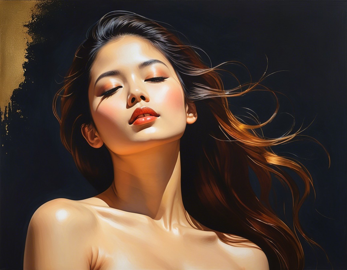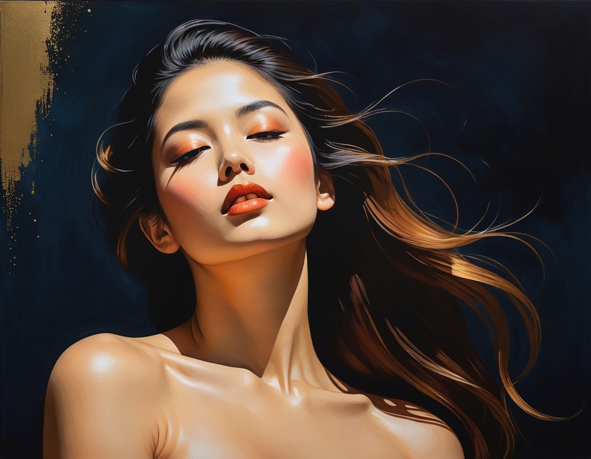 In a serene and modern Zen setting, an abstract yet figurative portraiture unfolds. Old masters's style, tonalism, renaissance style refrerence, multi-layered eyes, slim lips, flowing hair illusion, gradient inking colors, hatching. Shimmering, reflecting, rust-oleum blue, thinned paint #005a8c utilizing alcohol ink to create luminous effects, detailed tinily elements, bathed in golden lighting and soft light, novelty architecture elements, very defined Lissajous lines and beautiful line art. unique touch, warm color palette, sleepy, somnolent, slumberous, languorous but poised, posing, enhancing a simplistic headshot with precise Gelsculpt 64K rendering and a cel-shaded drawing style, stylized portrait, geometrical intricate linework, swirls, cymatics, surrounded by flares, vibrant coloring, fantastical micro-pen lineage, line-art detailing, stippling, push processing technique, post-avantgarde, paint dispersion and muted complimentary natural color gradients. The fluid art technique is evident in the light gold gradient,, shrouded in a pale cinewash. Luminosity 1.3, emulsion shifts, opaque, brightness 1.3, warm tones. Dynamic lighting 1.3, stylized foampunk, airy, joyful, glowing sunlight filtering, shimmering reflections. Enchanting, whimsical, mystical setting, vibrant watercolor and ink, picturesque scenery, colorful palette, high resolution for intricate details, 8k resolution for wallpaper, concept art quality, stunning color oil drawing on textured paper, reminiscent of Jean-Baptiste Monge's style. Capture the essence of William Turner's glowing landscapes, hues by Albert Bierstadt, majestic , warm coloring by Catherine Abel, morning light, fantastical, elegant touch, Amanda Clark's mysterious atmosphere. Infuse the artwork with the beautiful and intricate fantasy elements seen in Mamoru Nagano's style. Merge stunning color oil drawings with gouache details, creating visible textures akin to Ho Baron's work. Utilize a blend of sober oil on canvas