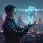 A young man stands against a futuristic cityscape, holding a glowing globe in his hands. The phrase "shape the future" appears above, symbolizing innovation and possibility.