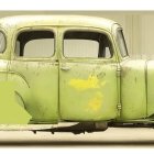 A vintage hot rod with a distinctive green finish, featuring a classic coupe design, large wheels, and a sleek, retro aesthetic. The car has a weathered look, adding to its character.