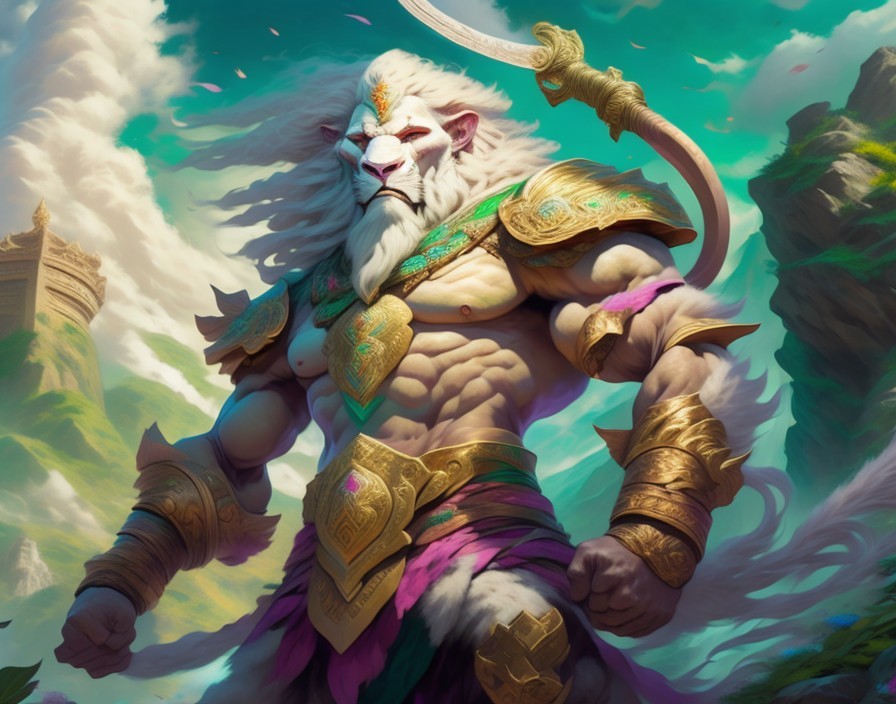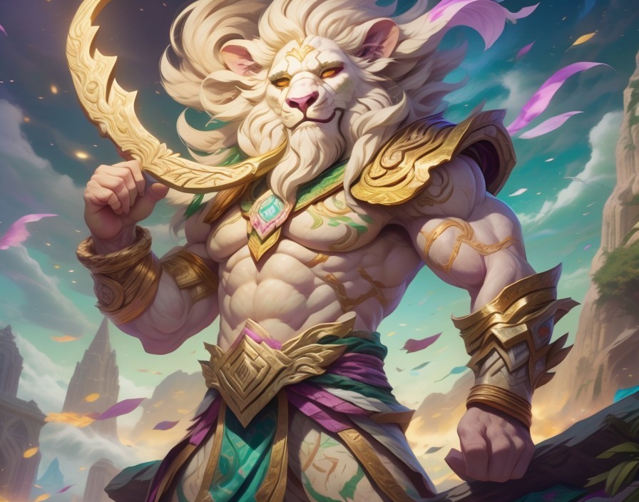 A majestic, anthropomorphic lion warrior smiles confidently, wielding a spear, adorned with golden armor under a luminous sky.