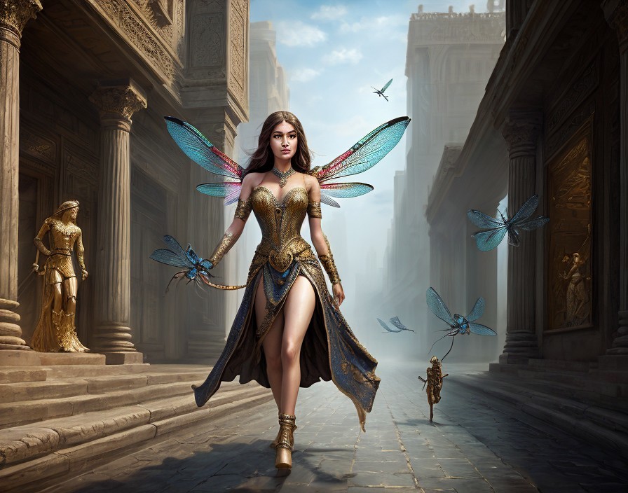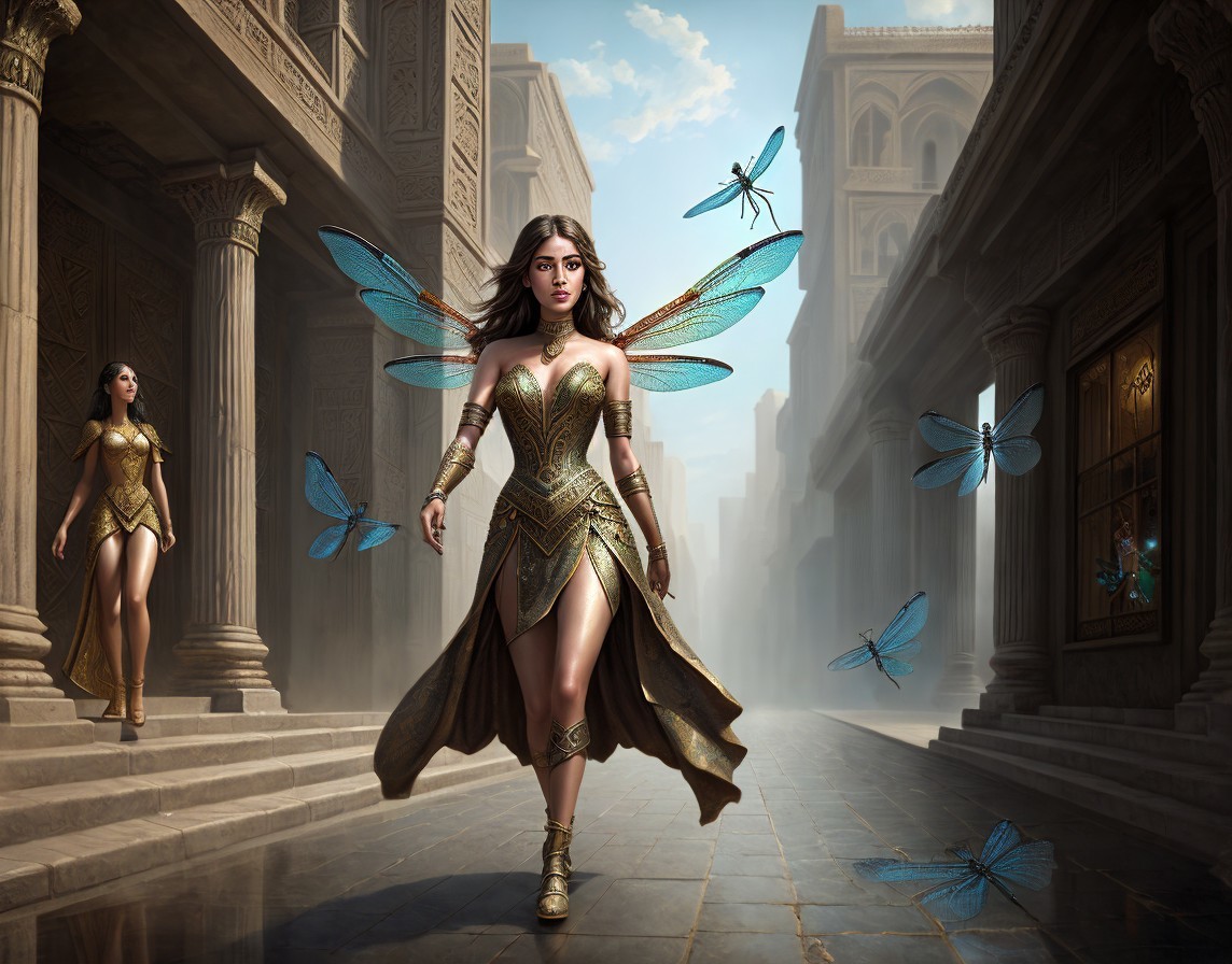 Two women with fairy-like wings stride confidently through an ancient, opulent cityscape, surrounded by fluttering, luminous dragonflies.
