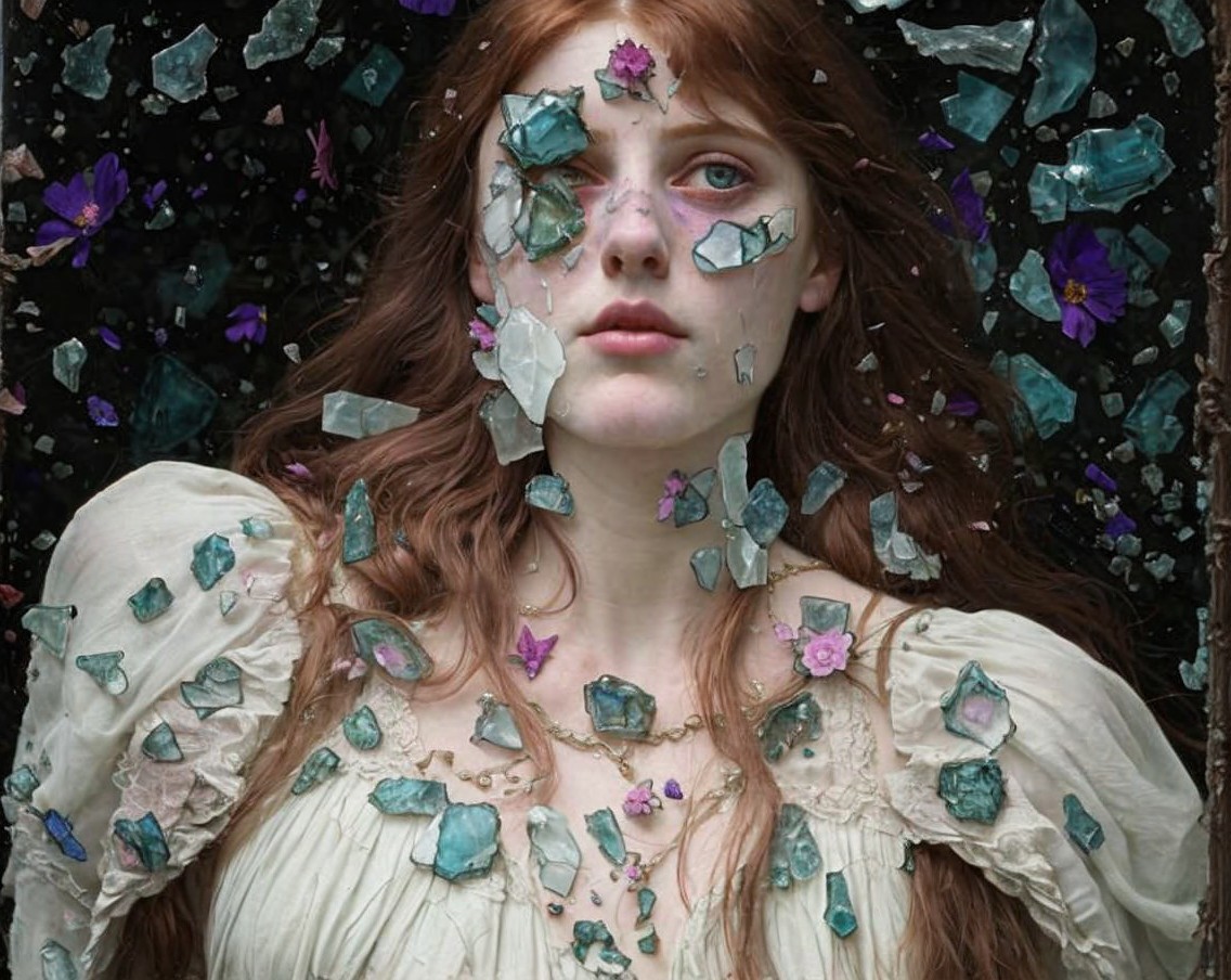 A woman with red hair is surrounded by floating blue and purple crystals and flowers, giving a mystical, ethereal vibe.