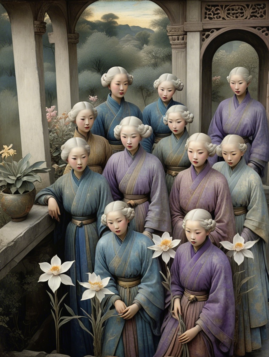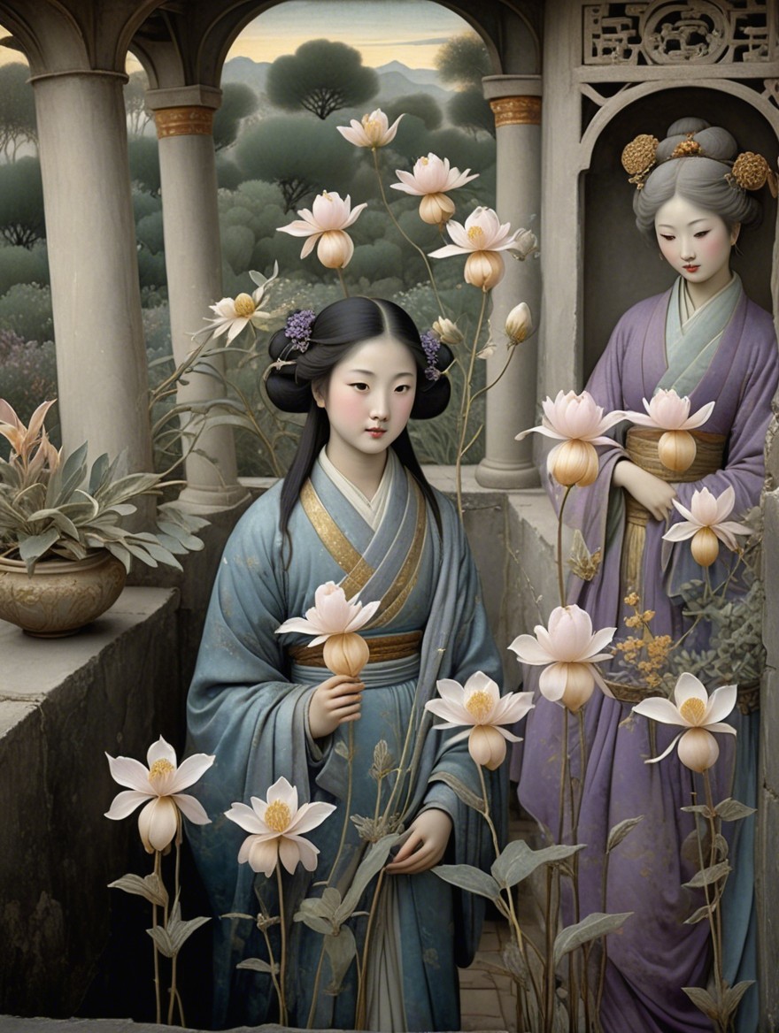 Girl in a beautiful garden, 3rd century Chinese miniature art, Velvet blush sky blue, sage, lavender, Shabby, Dull Gold, Amber Gray, marbled. dramatic