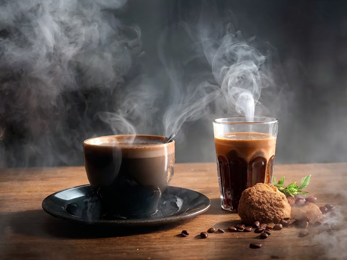 Two steaming coffee cups sit on a wooden table, surrounded by coffee beans and a decorative flower. The misty forest backdrop enhances the cozy atmosphere of morning serenity.