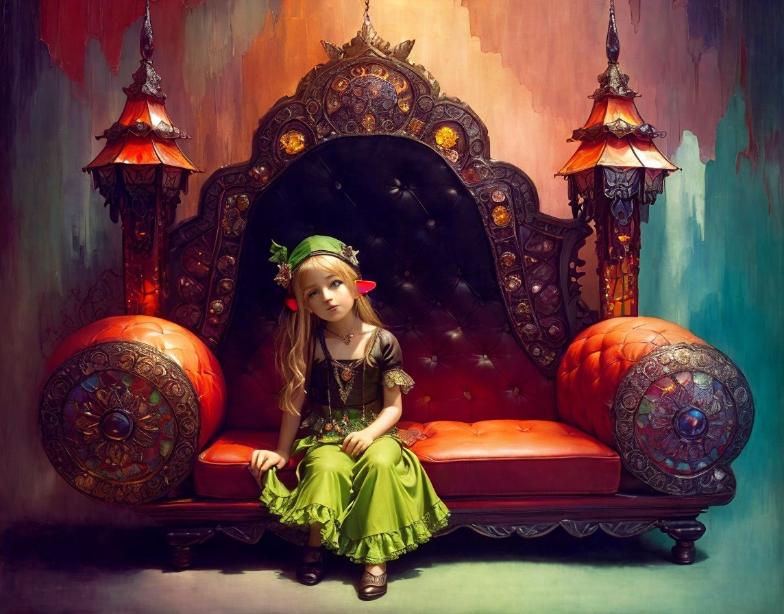 Prompt: "cute little elf is trying to burn a leather couch in the spacious castle bedroom , Chinese Crystals, Art Deco, Deep Rich Triadic Colors, Lalique Glass, style of Flamenco, moody, gloomy, desaturated colors, in the style of Paul Klee, Arthur Rackham minimalistic, fairytale, mystical lighting, alluring, abstract fantasy oil on canvas Picasso Oil painting Jean-Baptiste Monge no watermark Daniel Merriam no frame illustration Joan Miró modern dry brush"