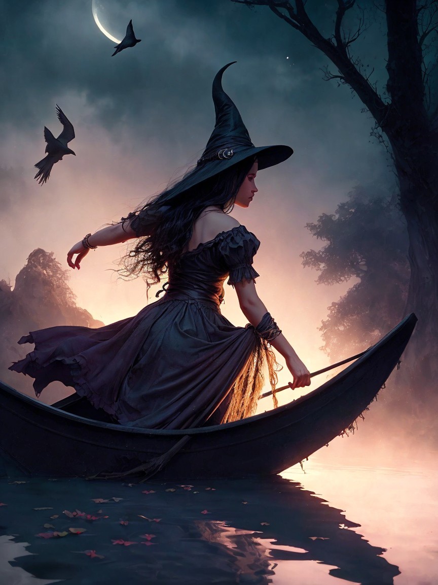 A silhouette of a woman in a flowing white dress sits in a misty lake beneath a full moon. Dark trees loom nearby, and birds fly across the night sky, adding a mystical atmosphere.