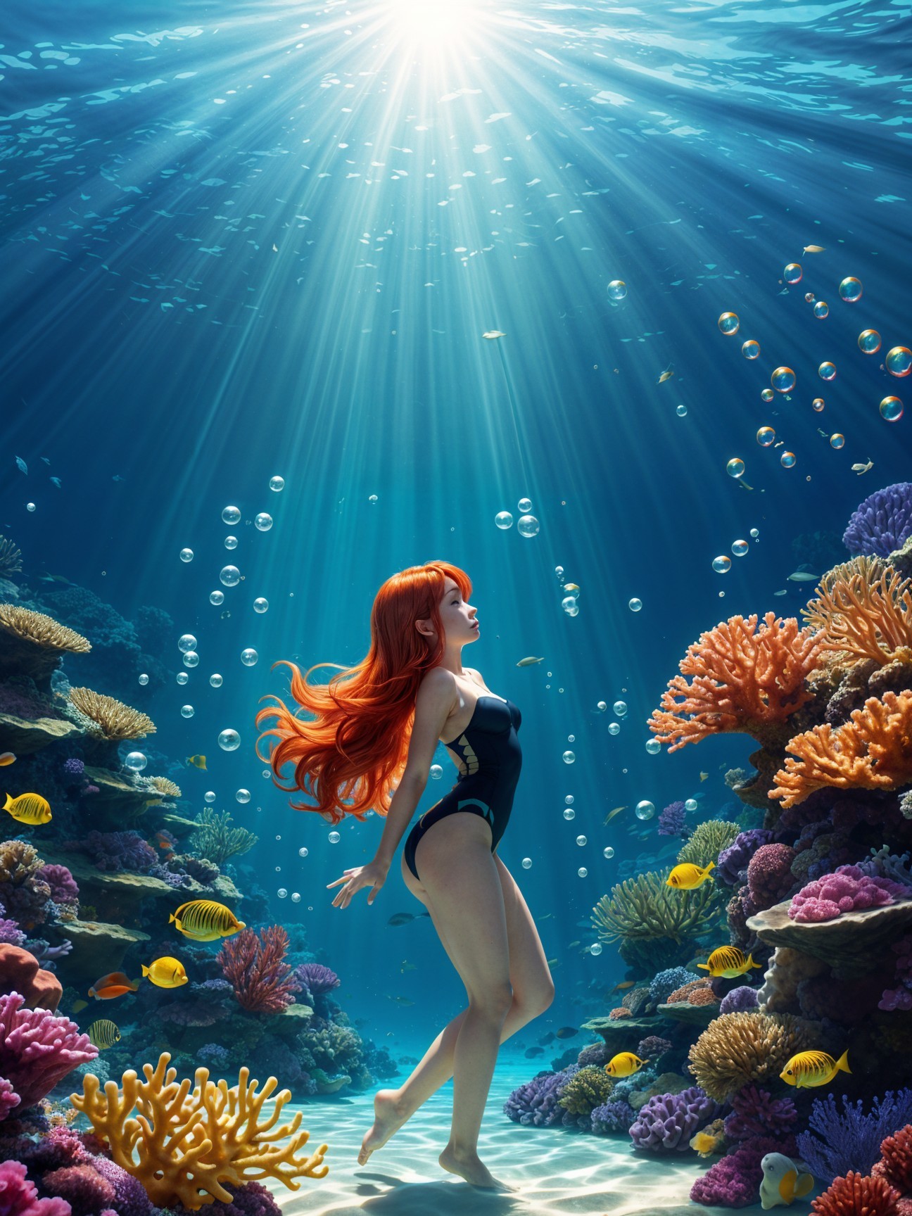Prompt: "Sunlight filtering through water, shimmering rays, rippling effect, aquatic ambiance, bubbles floating, serene underwater scene, coral reef background, marine life silhouettes, elegant pose, short red hair, tranquil expression, topless figure, natural beauty, high-resolution digital art, vibrant colors, dynamic lighting, surreal atmosphere."