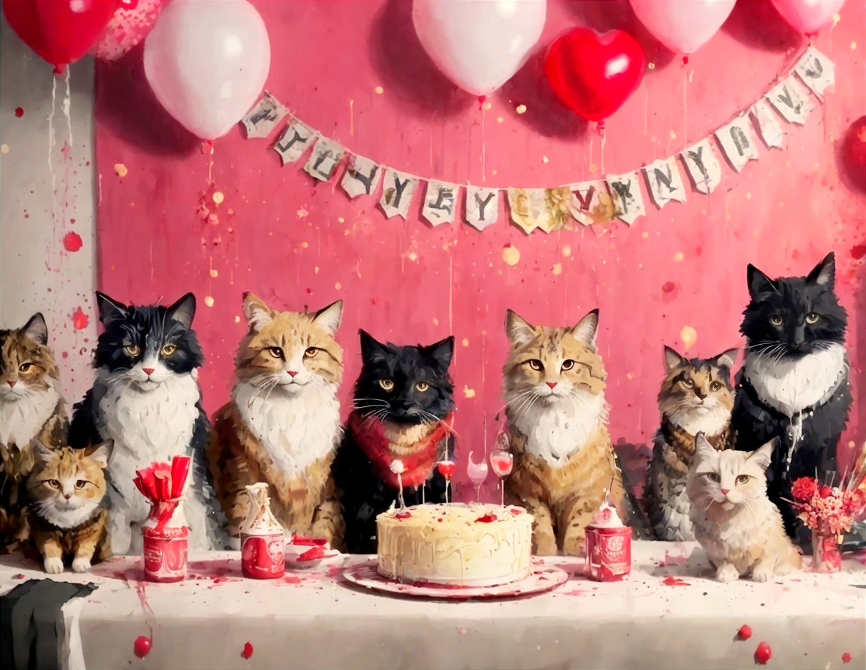 Prompt: 1582582: "Cats at Party table" Artwork with speedpaint elements {art by Brandon Woelfel, Petra Collins, artgerm, Miles Aldridge, featuring a collage of doodle art elements like hearts, swirls, and abstract shapes. She has textured, grayish-blue hair, adorned with small glowing spiky. The character's skin is fair with doll-like features, including freckles and a small heart under one eye, and she's wearing heavy, knitted gray sweater. Her hands are raised to her cheeks in a framing pose, with a backdrop of expressive street art including spray-paint splatters and sketches in black, white, pink, and blue tones, 3d, 8k in the surreal and dark comic style of Dave McKean Artwork}{& multi-layered stormy skies brewing, cool pigmented colors & red lips.,& shades of gra & black & indigo blue hyper fluid , hyper detailed mult-textures, semi-abstract, granular, structural textured micro-glitch Jos De Mey, textures including cross-hatching stippling pointillism, shading, stacking, Scribbling, contour lines, smudging, overlays, sgraffito, dry brushing, scumbling, impasto, frottage, collage sponging etching rubbing stenciling, array of line art styles & stacked lines}{surreal splash art, pale translucent skin, hi-res, photorealistic, Nikon Z9, 85mm F1.2, DOF, smooth and realistic HDR}